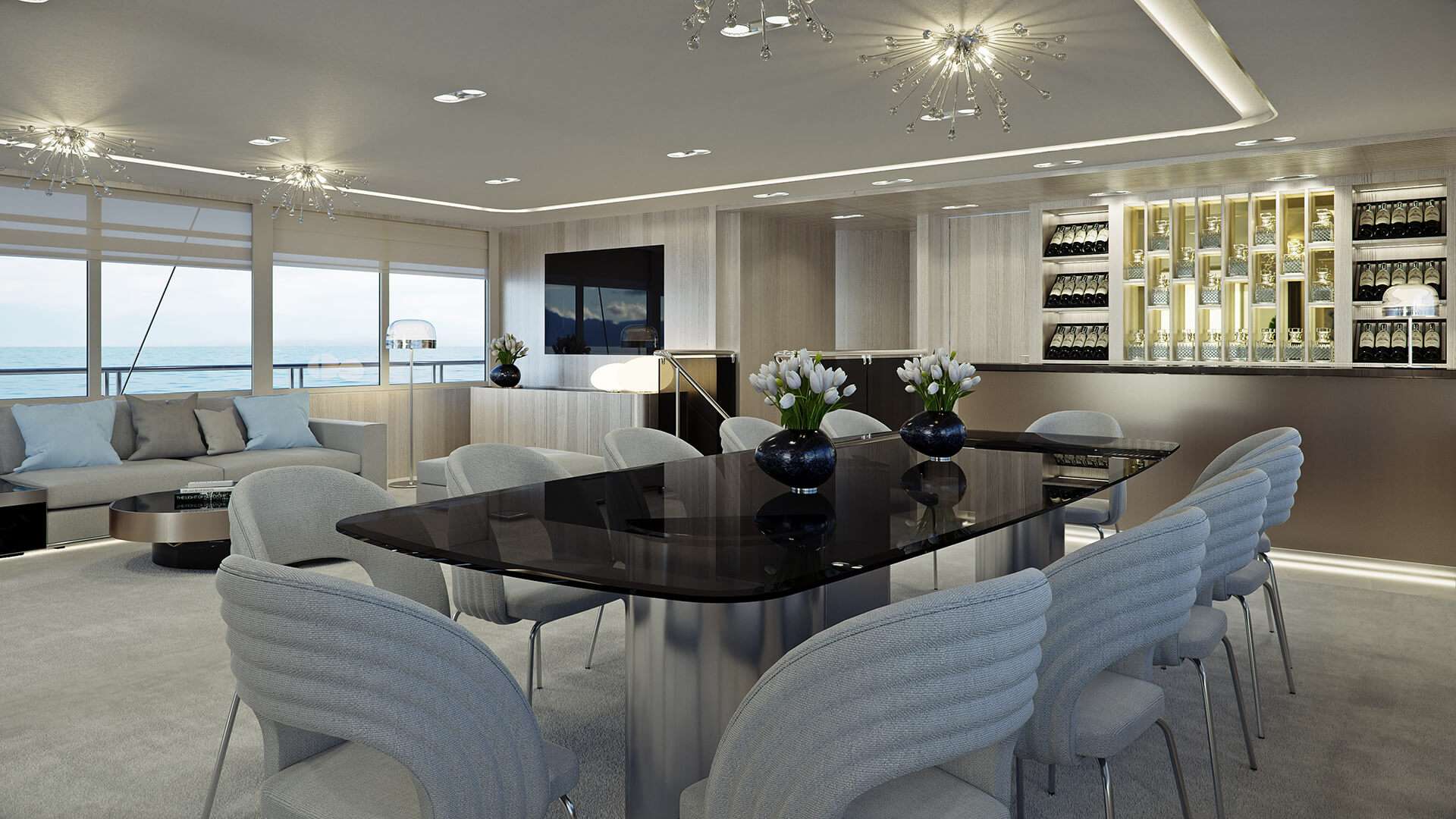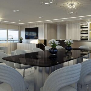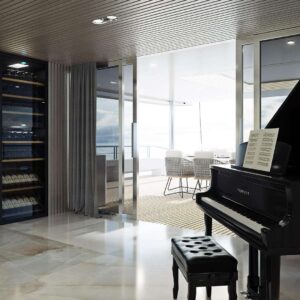 Poised between the dining lounges is the piano corner, so that music echoes divinely across the deck. The wine cooler and humidor are in the same space, making it easy to pair a favorite vintage and a favorite cigar with the color of each new sunset.