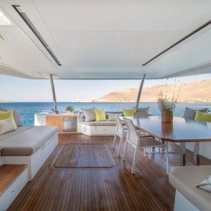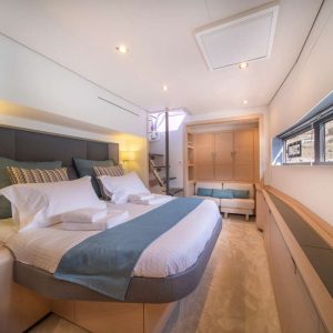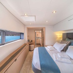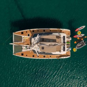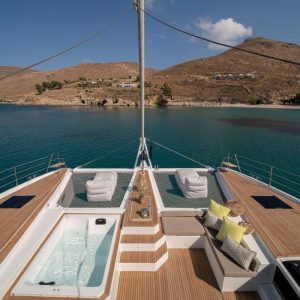 S/Y AETHER epitomizes luxury in a catamaran. Featuring an expansive flybridge with an authentic ocean terrace and a forward cockpit with a jacuzzi, she offers unparalleled comfort and style. Whether you’re seeking the thrill of sailing or the tranquility of lounging on sunbathing beds, S/Y AETHER provides the perfect setting.