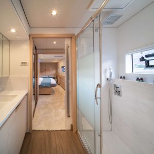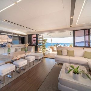 Her interior is stunningly modern and incredibly spacious, ensuring the utmost in comfort and luxury. She accommodates up to eight guests in four cabins, including one owner’s suite and three queen-bed cabins, each with a private bathroom. The flybridge and forward deck provide ample space for sunbathing and relaxation, while the aft cockpit is ideal for socializing and alfresco dining.