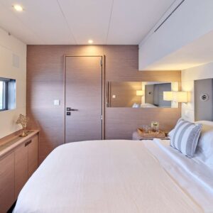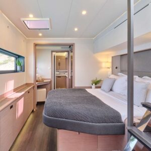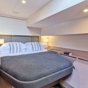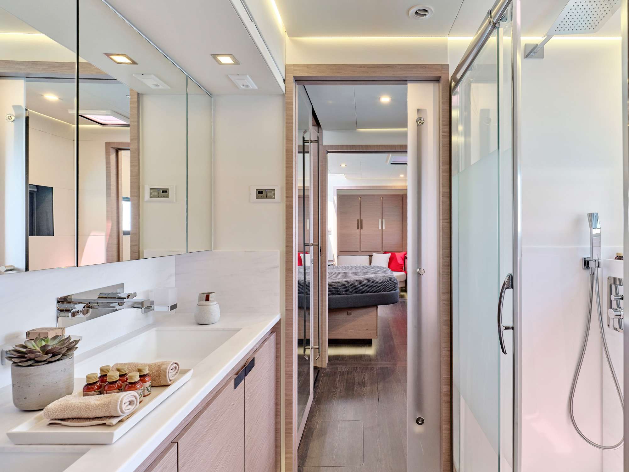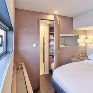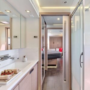 Alexandra II accommodates 8 guests in one master cabin with desk area, full size bathroom (double sink) and two access points (one from inside the yacht and one from the foredeck jacuzzi area).