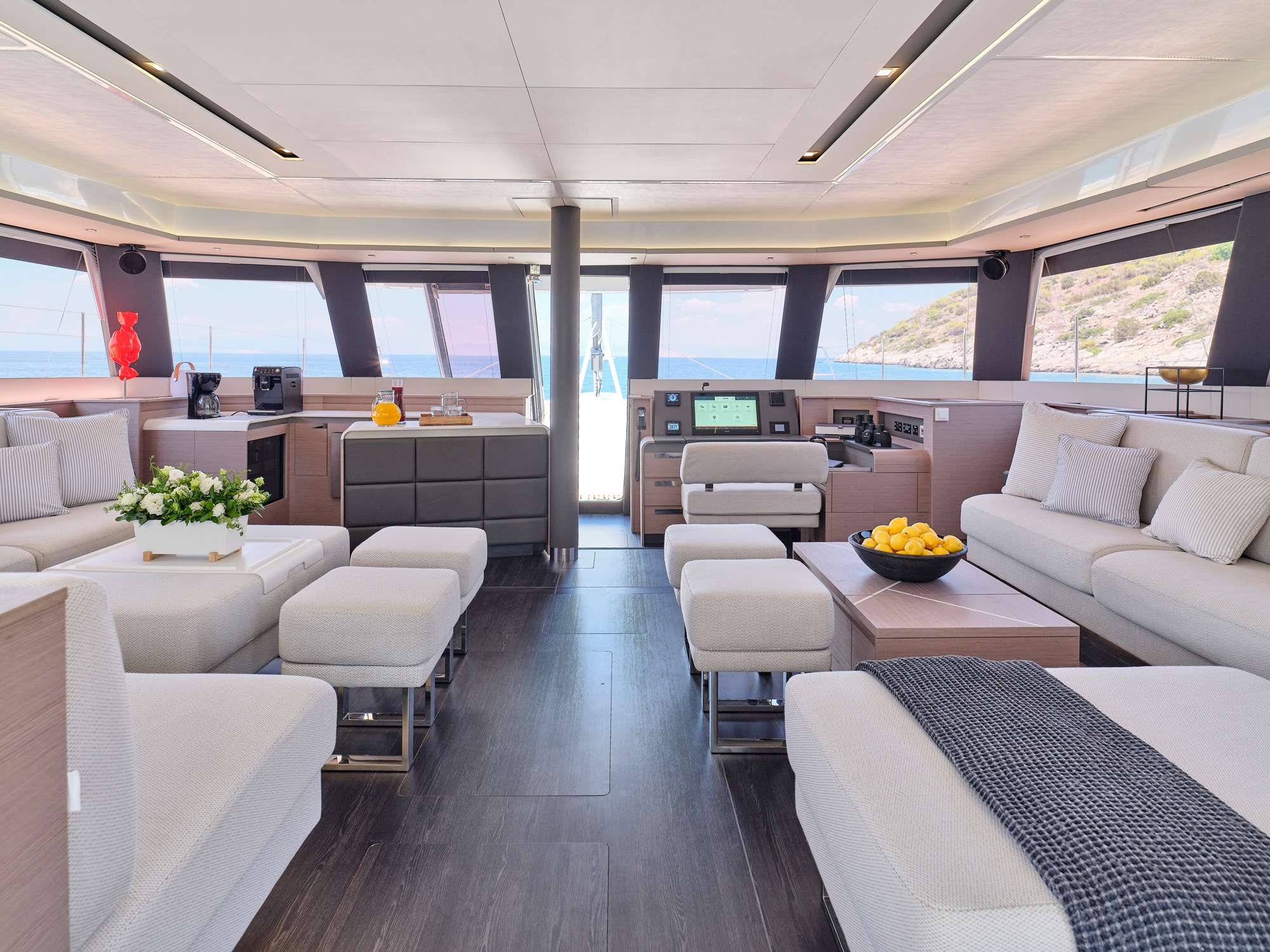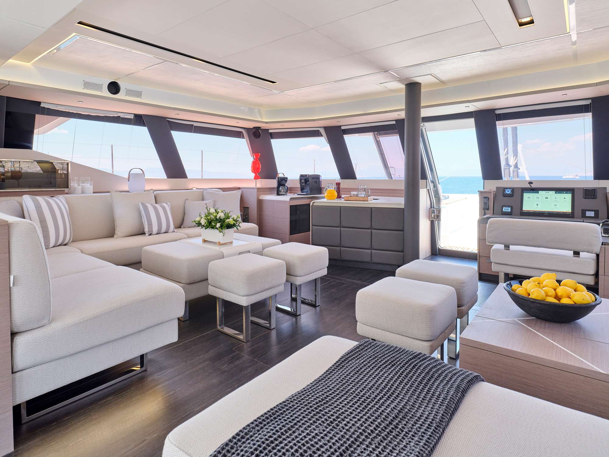 Moving indoors a full size saloon area to relax place cards or watch a movie. The kitchen is located in the lower deck.