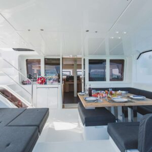 The Lagoon shipyard together with their yacht design partner VPLP who have used their experience of competitive sailing in developing a new style for a whole new generation of Lagoons, the Lagoon 52 is the first model introducing this new generation. With its diamond-shaped vertical bows, contemporary styled hulls and its levitated hardtop and with a taller rig moved aft the Lagoon 52 stands out from the crowd. But its originality goes a great deal further than just its “outer” appearance, or even its interior layout.