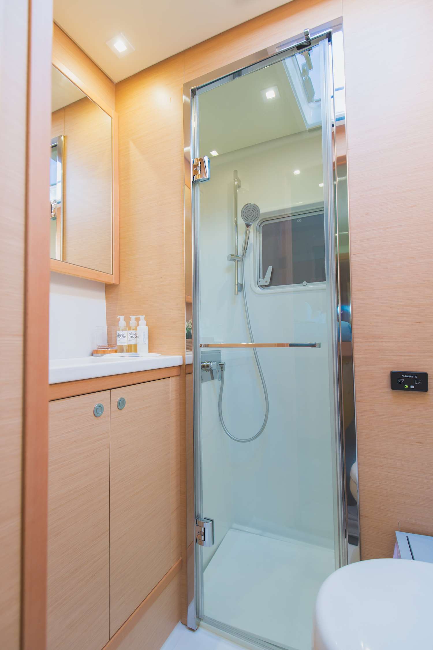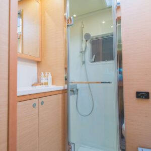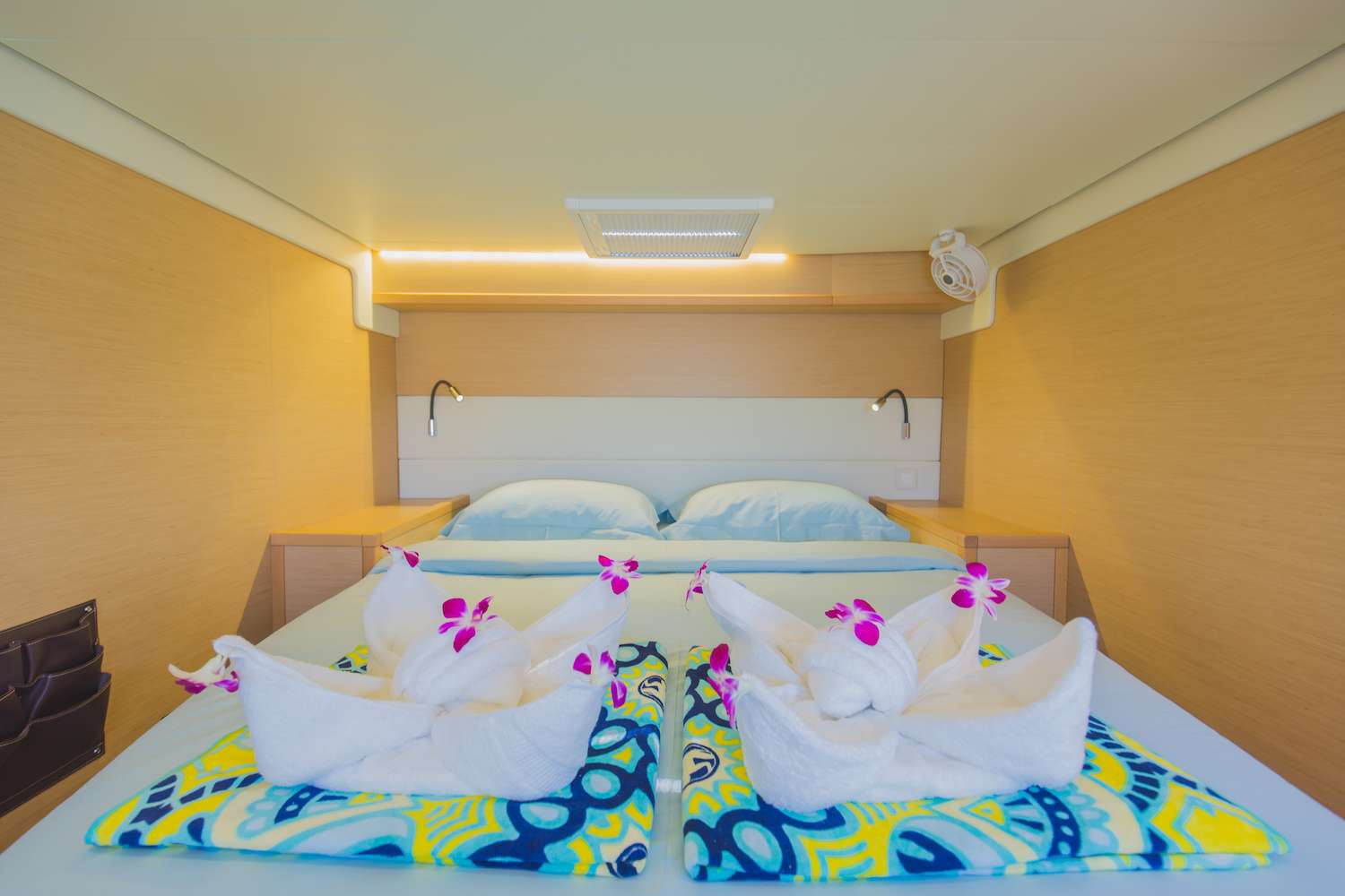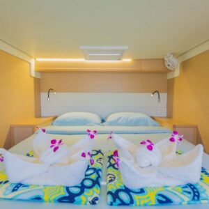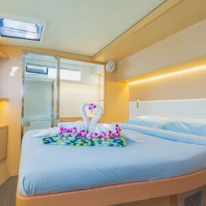 This Lagoon 52F in 2018 hull is in 5 cabin versions, including 4 queen cabins all with en-suite bathrooms and separate showers, and a bunk bed cabin with en-suite head. The cabins have incomparable natural lighting thanks to the fixed hull windows, together with excellent ventilation thanks to the deck hatches and portholes that open out to the hull-side or to the cockpit.