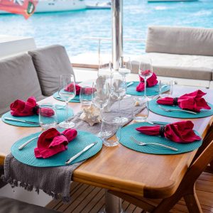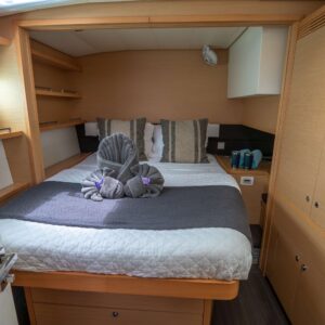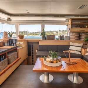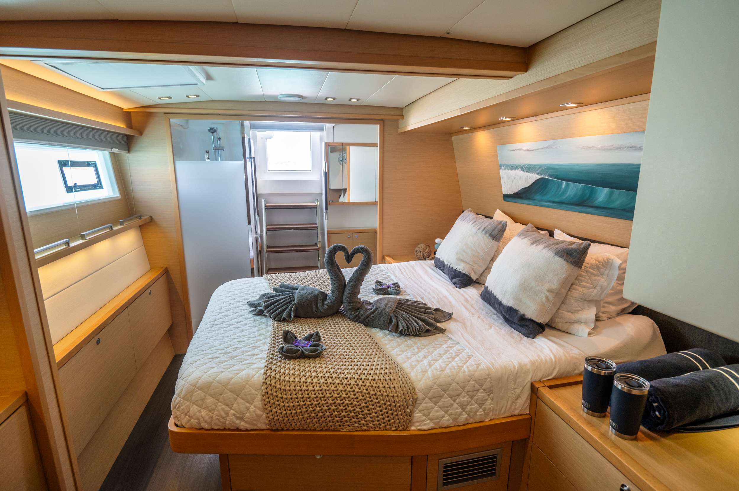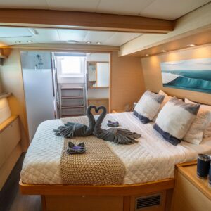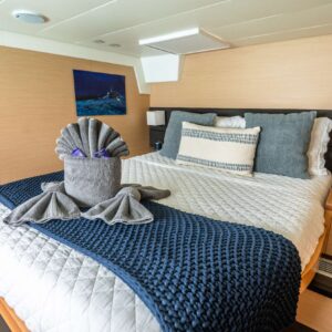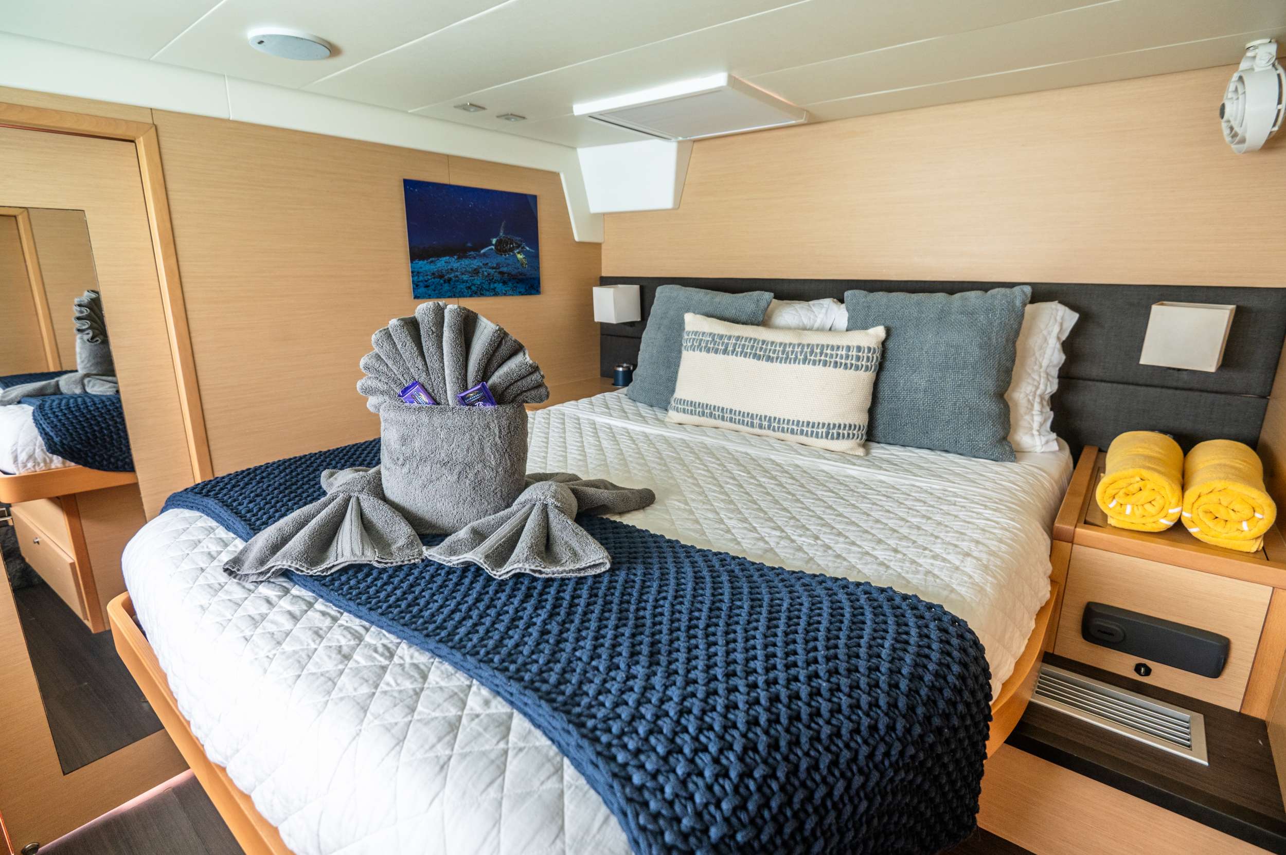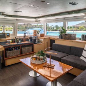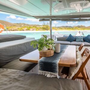 No expense was spared in outfitting this gorgeous luxury sailing yacht which offers four guest cabins (for 8 guests), each with their own private bathroom, a salon with 360 degree windows, 2 dining areas and a foredeck sitting area. Amenities and toys include TVs in each cabin, 2 trampolines, a 15-foot tender for wakeboarding, tubing or zipping to gorgeous beaches, 2 standup paddleboards, a floating dock, a hydraulic swim step for easy water access, and snorkeling and diving gear. Bluewind’s elegant yet minimalist design provides the handling of a performance sailing catamaran while offering the ambience and amenities of a world class resort on the water. Spacious design of the cockpit and flybridge areas offer guests panoramic vistas, al fresco dining and ample space for lounging, whether in sun or shade.