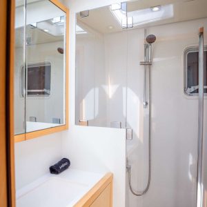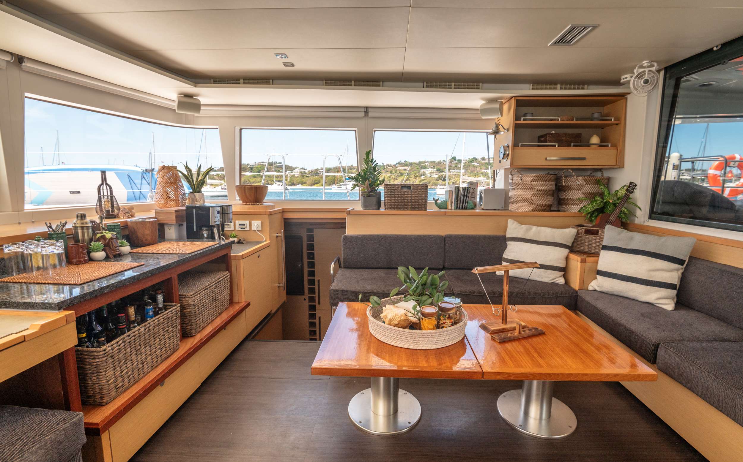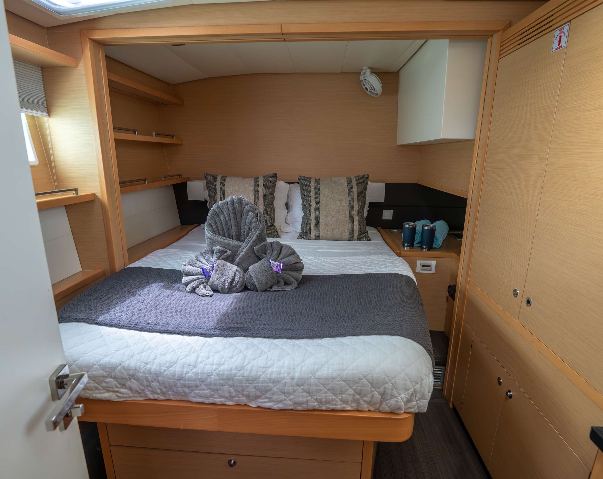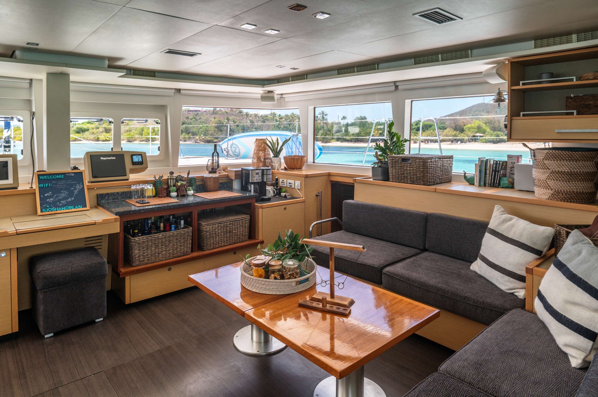No expense was spared in outfitting this gorgeous luxury sailing yacht which offers four guest cabins (for 8 guests), each with their own private bathroom, a salon with 360 degree windows, 2 dining areas and a foredeck sitting area. Amenities and toys include TVs in each cabin, 2 trampolines, a 15-foot tender for wakeboarding, tubing or zipping to gorgeous beaches, 2 standup paddleboards, a floating dock, a hydraulic swim step for easy water access, and snorkeling and diving gear. Bluewind’s elegant yet minimalist design provides the handling of a performance sailing catamaran while offering the ambience and amenities of a world class resort on the water. Spacious design of the cockpit and flybridge areas offer guests panoramic vistas, al fresco dining and ample space for lounging, whether in sun or shade.
