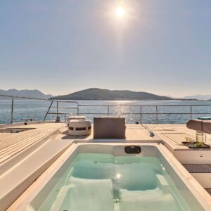 Her vast 32m² Flybridge, foredeck with Jacuzzi, and Owner suite are simply remarkable and all enjoy direct access from the saloon.