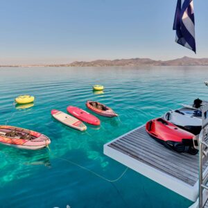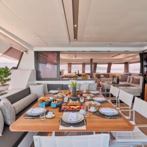 Her 36m² cockpit is designed for unforgettable social occasions, opening fully onto the lounge with several sunbathing spots, a galley with a plancha grill and a dining setting to cater for a large number of guests.