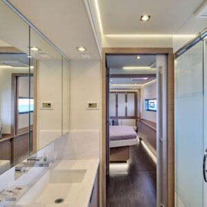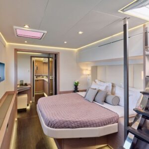 In the Owner’s cabin suite is a dedicated 22m² private apartment featuring a capacious dressing room with sofa. An exclusive door to the front Cockpit provides convenient exterior access while retaining privacy, and the Owner’s bathroom epitomizes luxury at sea with a spectacular walk-in shower and designer twin vanities.