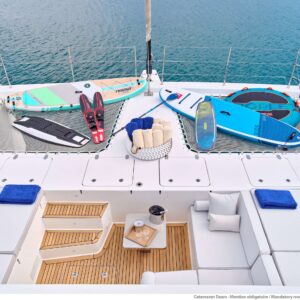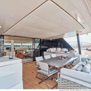 Up on the catamaran’s impressive flybridge, guests can gather for lounging and drinks on the welcoming and pampering sofas. Versatility of this area allows it to also serve as a perfect space for yoga or light exercising, all while enjoying the spectacular sea view.