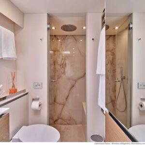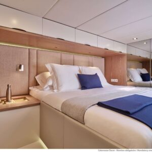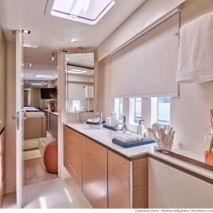 DAWN’s light-filled interiors provide a relaxing and harmonious feel by its neutral and calming, yet stylish decor. Up to 8 guests can enjoy sophisticated accommodation in the yacht’s three classy ensuite cabins plus the stylish master suite. The bright main saloon, generous stern cockpit and ample front terrace merge into one luminous semi-open lounge area with a functional galley, cozy settees, a widescreen LED TV and a big table for 8 guests. While the well-equipped galley provides for fine cuisine, the indoor herb garden ensures a steady supply of freshness to DAWN’s rich menu.