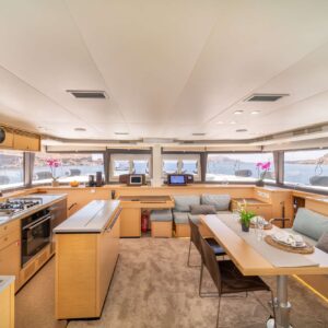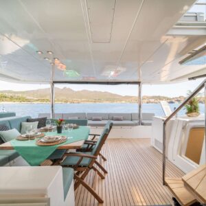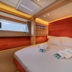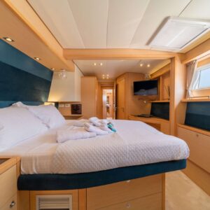 The cabins are spacious with storage areas for guests, ensuring maximum comfort and privacy. From her lovely flybridge and al fresco dining area, to her shaded spaces on the main deck and the sunbathing trampolines forward, she covers every base for relaxation and entertainment.