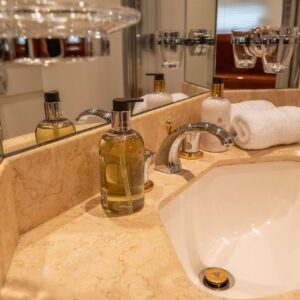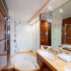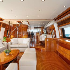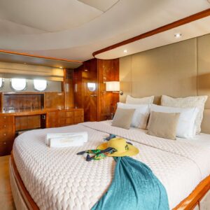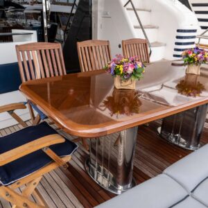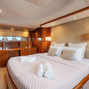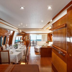 The delightful 23.55 m (77′ 3″) motor yacht GEKTOR ,originally built in 2004 by Princess has recently been refitted and can accommodate up to nine guests in four ensuite cabins for charters around Greece. Her flybridge design creates wonderful space for guests to spread out across a choice of sheltered or open zones, perfect for dining or sunbathing. Bench seating and sun pads are cushioned for ultimate comfort and a water’s edge swim platform creates the perfect launch pad for guests to enjoy the great selection of water toys. The refit has updated the classic interior, retaining the original gloss wood paneling but improving the décor and soft furnishings.