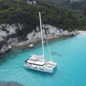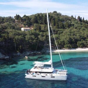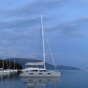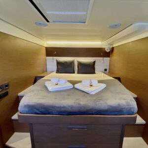 S/Y Grace is a Lagoon 620 Essence and she is based in Preveza Marina, right in the heart of the Ionian Sea. She accommodates 8 guests in 4 large en-suite cabins. One master cabin with direct access to aft deck, one VIP cabin with direct access to aft deck and two queen bed quest cabins all with private bathrooms. She has a spacious cockpit for dining al-fresco and fly bridge for 360 degree views and perfect area for cocktail hour. She is equipped with a hydraulic platform – ideal for direct access to the sea.
