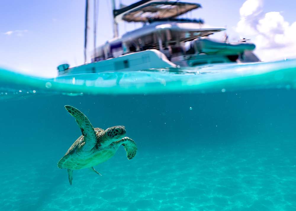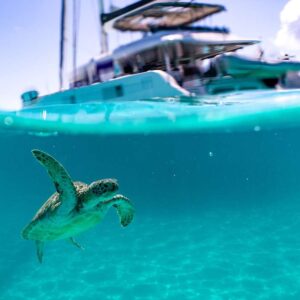 The boat is fully equipped with snorkeling equipment and an abundance of water toys. For those interested in scuba, Huntress has an assortment of top-of-the-line dive gear for that off-the-boat diving experience. Your captain is a fully certified Divemaster and would love to share his passion for diving with his guests and can lead guests on their dives. After an adventure filled day of water sports, swimming, diving, or on-shore excursions, enjoy the well-lit and large cockpit dining area as you enjoy a world class meal with your friends and family. Enjoy a handmade cocktail prepared just for you by your professional crew right there at the cockpit bar. Top-tier service is central to life onboard Huntress, and only adds to the exclusive feel of this impressive experience. You will know the meaning of peace, relaxation and class when you charter with us on Huntress. Swimming in the turquoise waters of the Caribbean you’ll wonder why you never did this sooner.