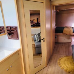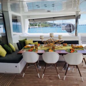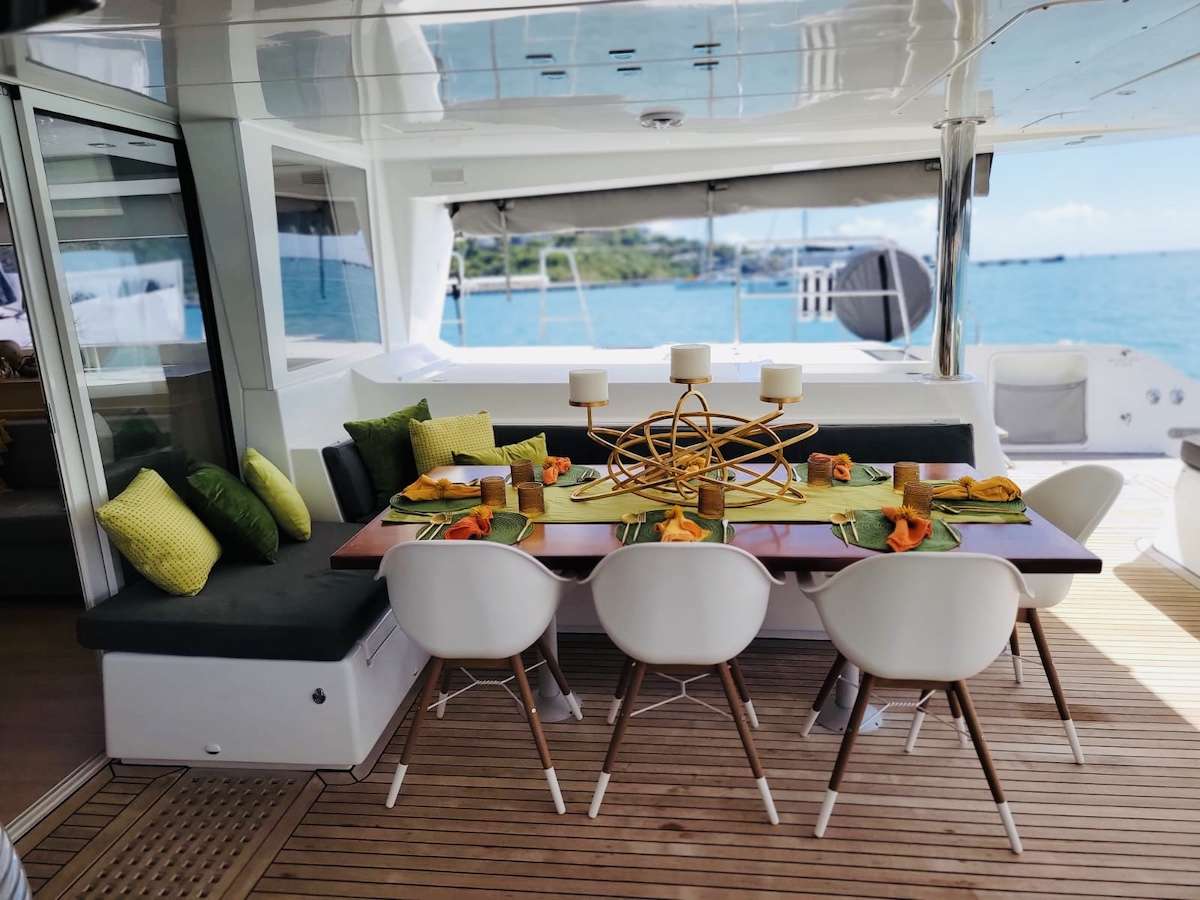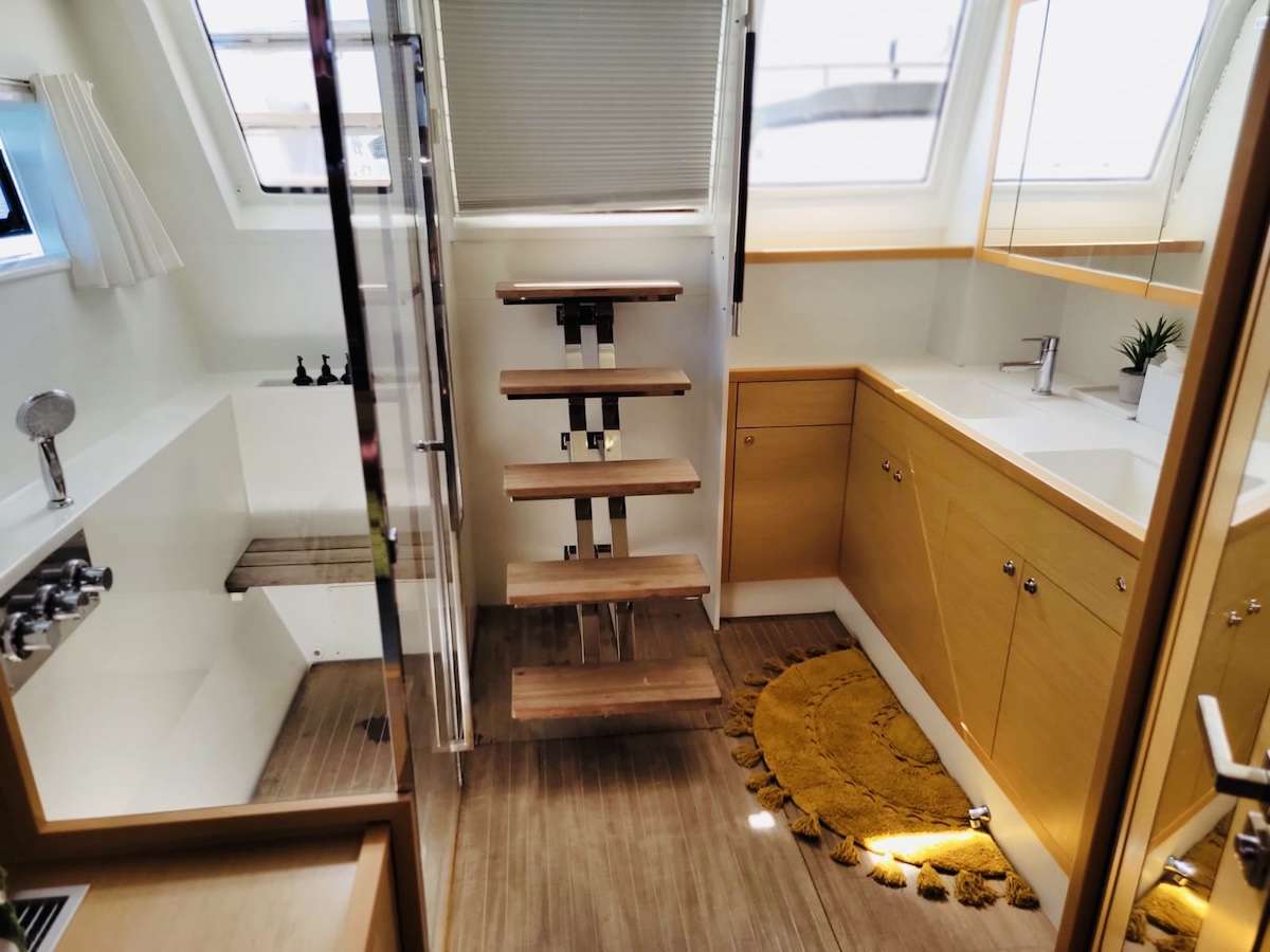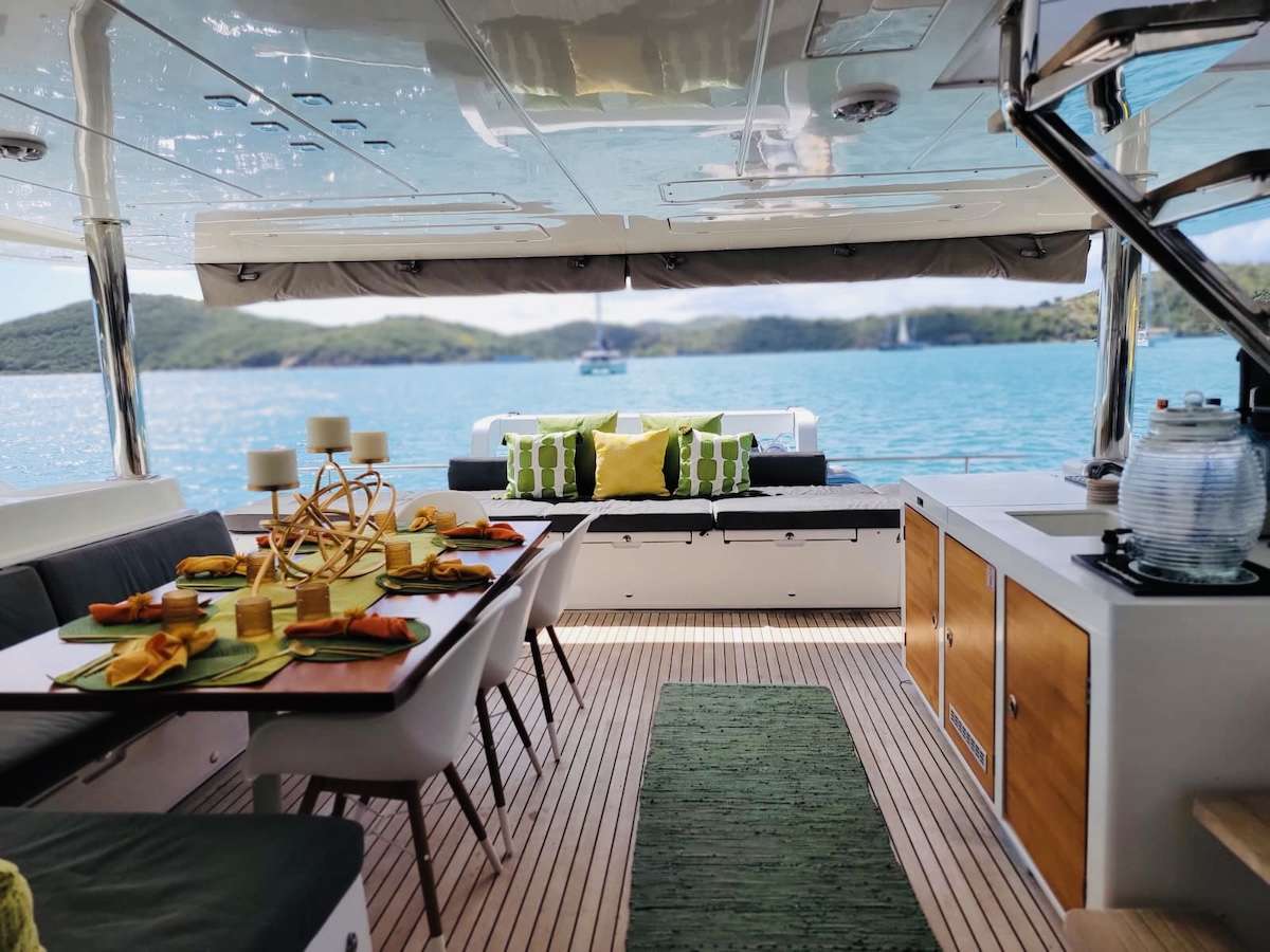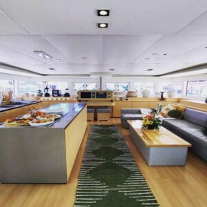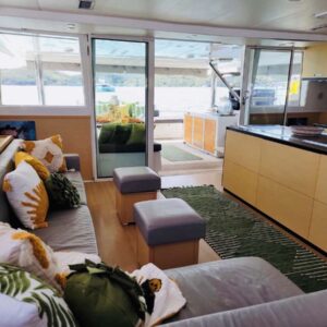 The design of the 620 has been perfected for socializing with seemingly endless space both above and below deck. This yacht shows why it is the gold standard as the setting for the perfect guest experience. With multiple dining, living, sunbathing, and lounge areas to choose from, you will always have the space to sneak away for some shade or to read a book…. or you can choose to get as involved as you desire. As a larger catamaran, you can count on greater comfort while at sea, and a second-to-none sailing performance during navigations. The salon is extremely spacious, thanks to well thought out style and intelligent design with large windows ensuring all are able to enjoy the beautiful scenery from the salon in 360 degrees. It features a U-shaped sofa and coffee table for lounging.