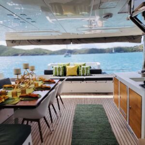 The exterior of Huntress is equally impressive. You can relax on the perfectly configured deck spaces that are equipped with areas for socializing without sacrificing privacy. There is no better way to revel under the Caribbean sun. The covered flybridge is home to a huge comfortable and sleek sofa and additional bench seat. It is the perfect space to enjoy the beautiful views, gorgeous sunsets, and witness the amazing milky way while at anchor. The comfort and views of the flybridge make it the best place to be, while underway, for dancing the night away and enjoying sunrise yoga.