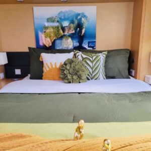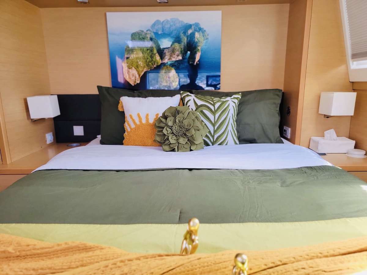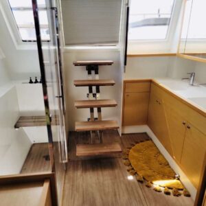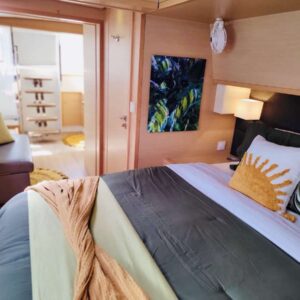 Huntress hosts up to 8 guests in four queen-sized, air-conditioned cabins. Each cabin has its own, private ensuite bathroom with a separate shower. The master suite is elegant and roomy and includes seating/lounge area and desk, queen size berth, large glass shower stall and separate vanity area and offers direct access to aft deck for slipping out to gaze at the stars and take a midnight dip off the stern. The master suite also has direct private access to the main salon.