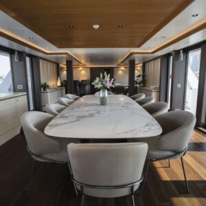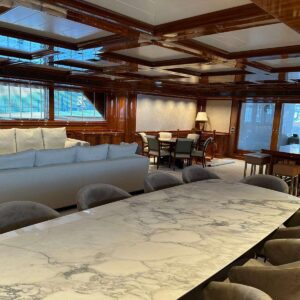 Isabell Princess of the Sea has all the elegance and finesse of a Classic yacht, combined with benefitting from a €10m refit which was completed in 2023, bringing her interior up to modern day standards and prerequisites. The Master suite comprises of a Main Bedroom with lounging and make up areas, a walk in wardrobe room with clothes and shoe storage, an office, and his & hers bathrooms. There is a compact VIP Cabin on the Bridge Deck, with four spacious cabins on the lower deck, 2 doubles and 2 twin, with each of the latter having a pullman bunk.