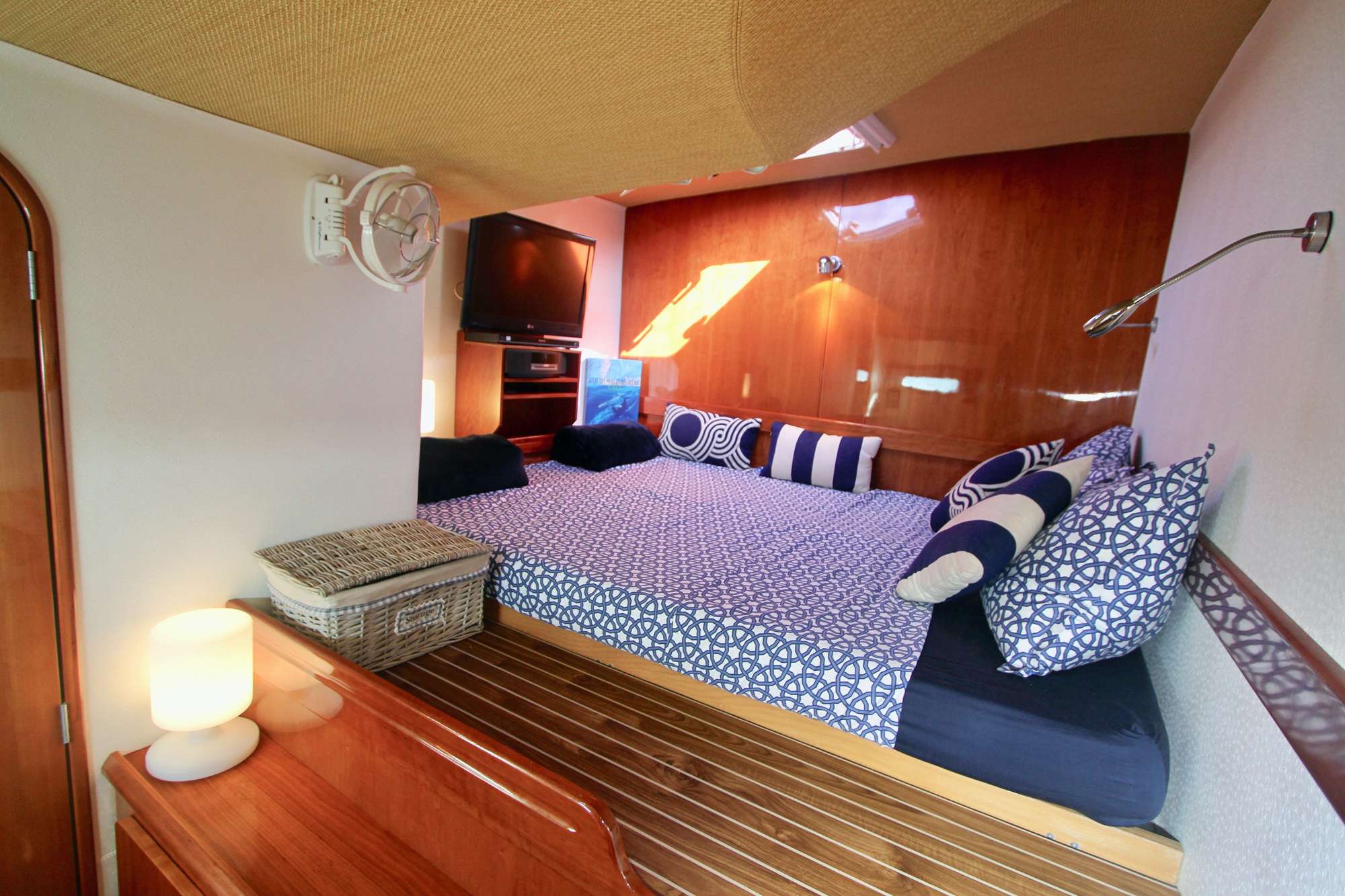 The design brief for ISOLABLUE demanded luxury interior and exterior spaces that are equally practical and comfortable. Interiors are beautifully executed with elegant built-ins, stylish upholstery and high-quality joinery and finishes. The salon and dining area are spacious and flooded with daylight. Guest relax in comfort on plush, u-shaped seating around the oval dining table.