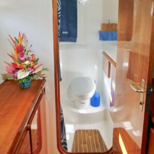 The large cockpit is the preferred spot for dining al fresco with magnificent views. Easy access to wide transoms makes launching water toys and diving into the Caribbean Sea effortless fun, even for children. Snorkeling or diving right off the yacht is spectacular. Captain Laurent is a licensed PADI instructor and Chef Astrid is a licensed PADI Divemaster and they offer one complimentary dive per diver and thereafter $90 per dive per person. Chef Astrid took the first place at the 2018 Grenada Charter Yacht Show Culinary Competition.