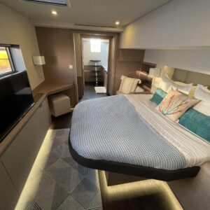 The expansive aft deck has a huge dining table where the entire group can dine together al-fresco. The sliding aft doors seamlessly open into the salon to create an ideal, indoor/outdoor environment. Krazy Kat is the popular ‘galley up’ layout so guests can enjoy lounging in the comfortable saloon, while watching the chef prepare their epicurean delights! The layout of Krazy Kat fully embodies the French way of life that celebrates the philosophy of ‘carpe diem.’