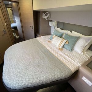 Below deck, Krazy Kat has 4 beautiful double cabins, accommodating 8 guests. The master suite is to starboard aft, with a huge walk-around Queen bed, and a stunning en-suite bath. There are three other beautiful guest cabins, all with walk around Queen beds and en-suite heads.