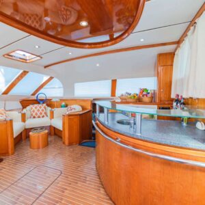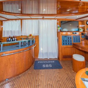 On entering the interior, the cherry-wood saloon has plenty of light, multiple seating areas – for coffee and dinner – a large TV, sofa, and a well-placed wet bar for the crew to prepare drinks and cocktails. With the galley down in the starboard hull, guests will have even more room to socialize and relax. Typically, guests dine outside in the expansive cockpit seating area.