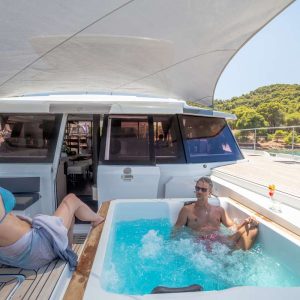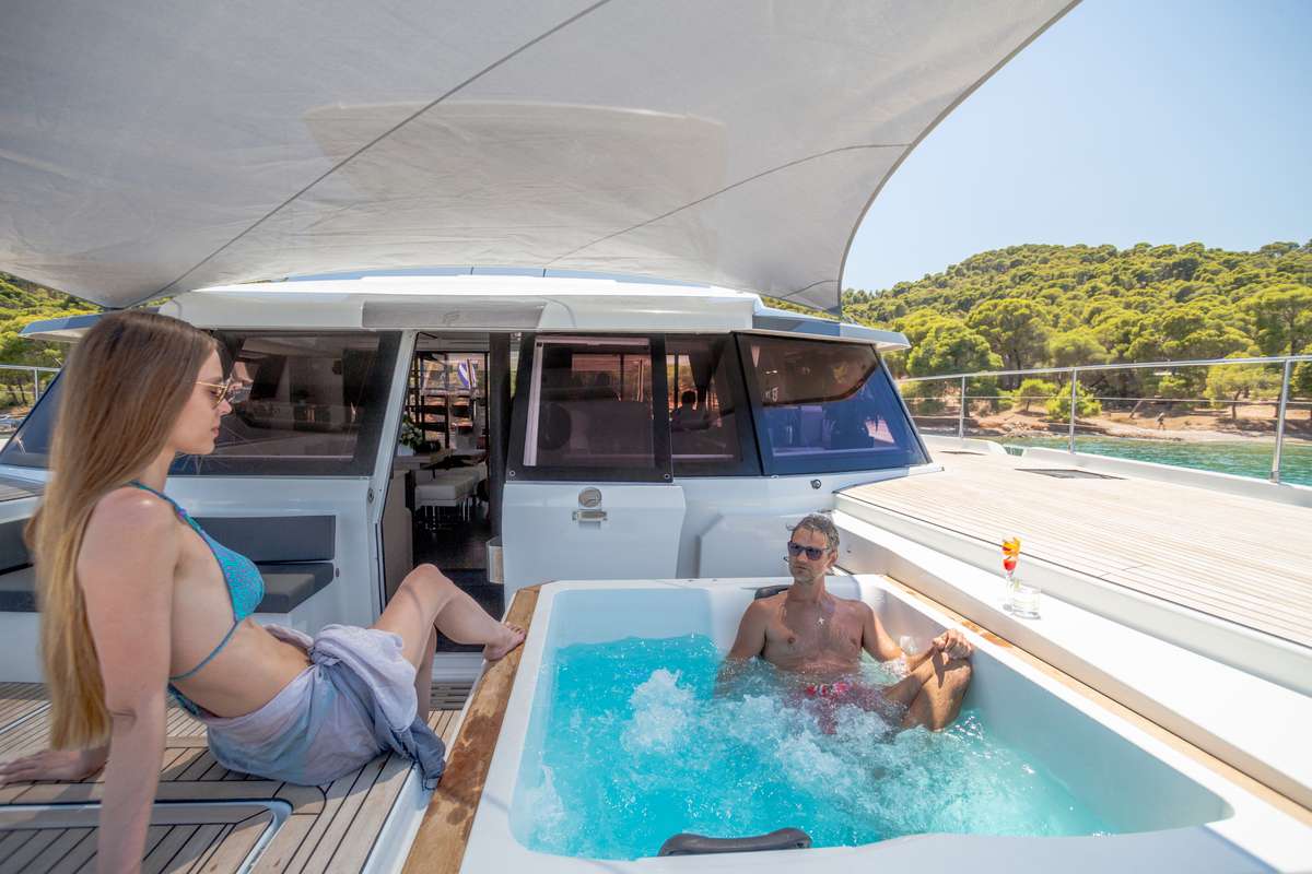 Indulge in the spaciousness and comfort that Majesty of Greece offers, where every inch is designed for your relaxation and enjoyment. From the expansive cockpit perfect for social gatherings to the sun-kissed flybridge and the inviting foredeck with a Jacuzzi, this yacht is your luxurious playground on the water.