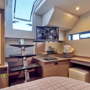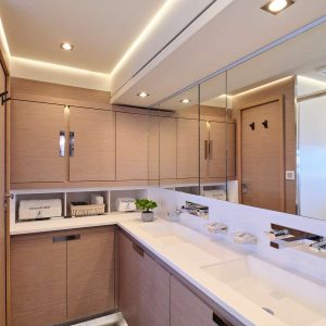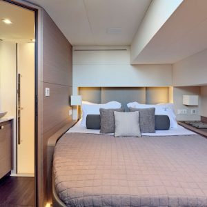 Retreat to the Owner’s suite, a private sanctuary that rivals the comfort of a high-end hotel. A lavish dressing room, a cozy sofa, and an opulent bathroom with a stunning walk-in shower await you, ensuring that every moment on board feels like a pampering escape from the everyday.