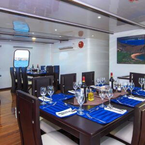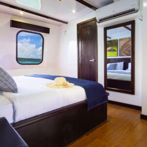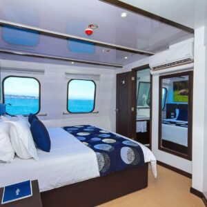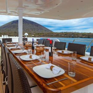 This intimate ship can comfortably hold up to 16 passengers on 8, 5, and 4-day Galapagos tours. Travelers will enjoy every part of their trip with gorgeous views from the sundeck with a jacuzzi, delicious meals in the barbecue and al fresco dining areas, and a safe internal staircase.
