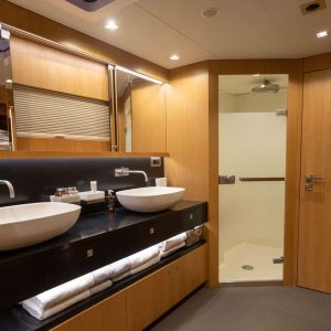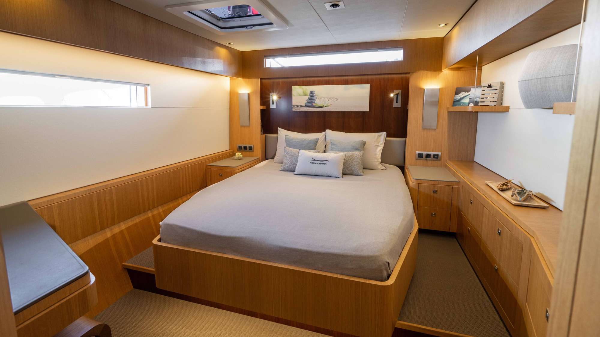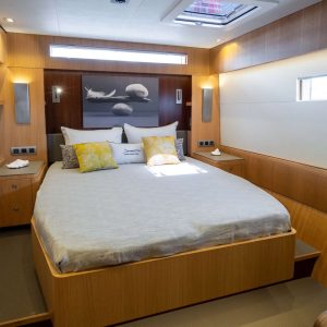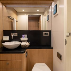 NDS Evolution can accommodate up to 9 guests in four beautifully appointed staterooms below deck. The full beam Master Stateroom with its panoramic view features an office desk and a serene corner lounging area with a private access to the forward deck. The guest staterooms consist of two Double and one Triple stateroom, making NDS Evolution an excellent option for families with kids.