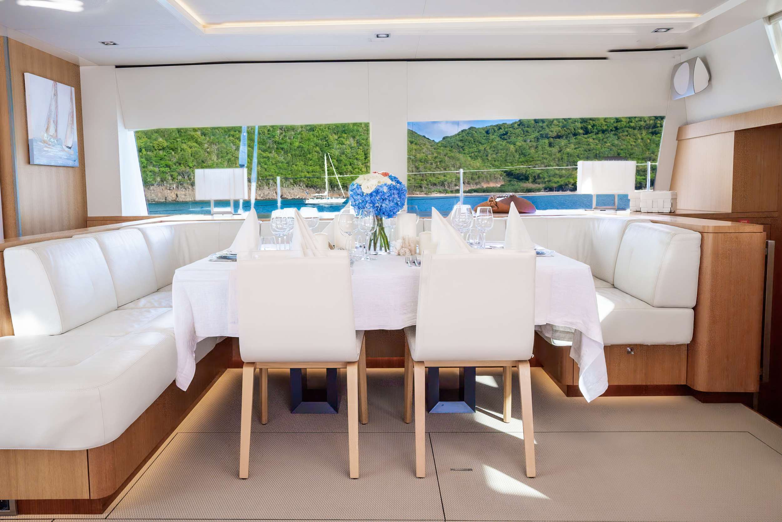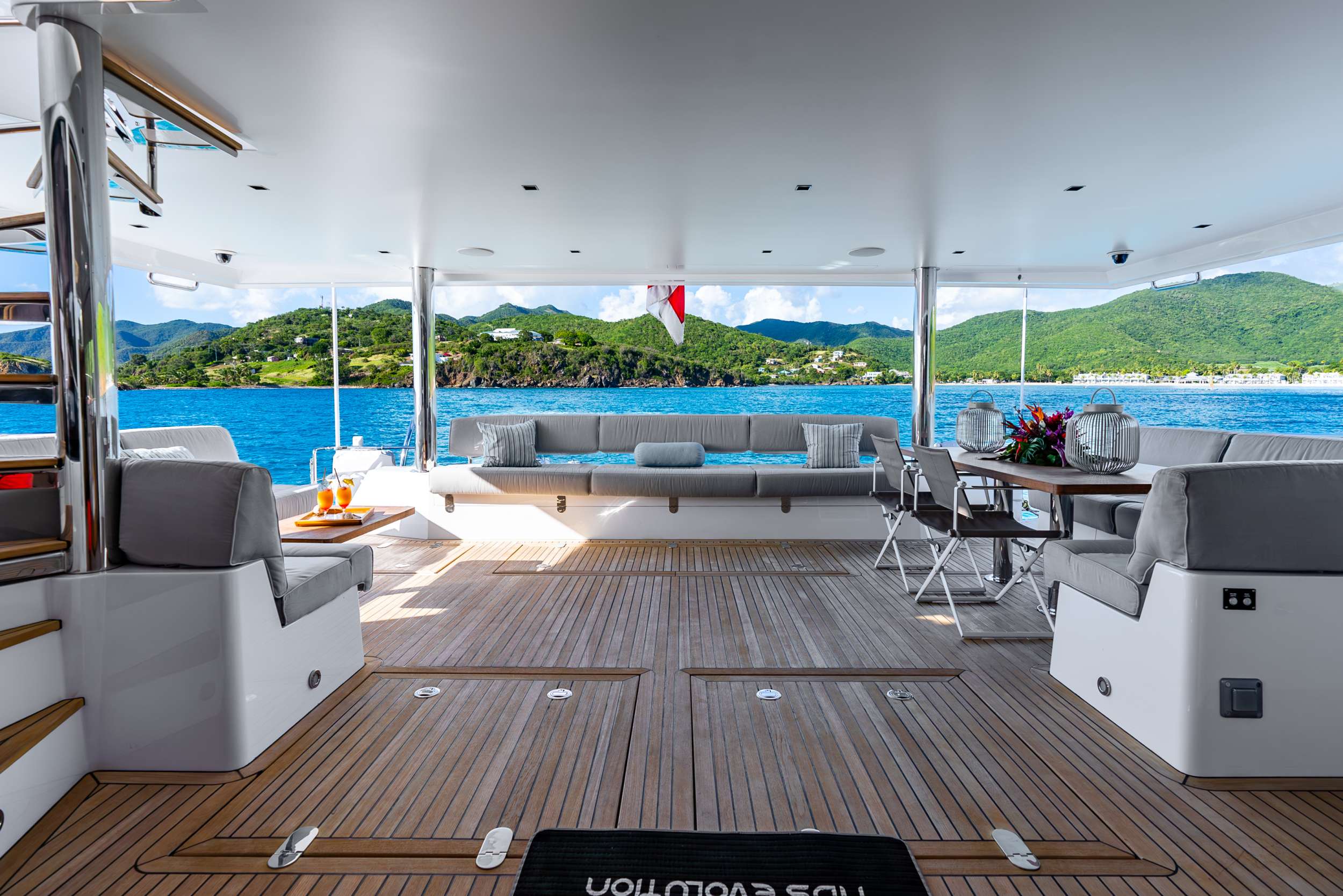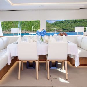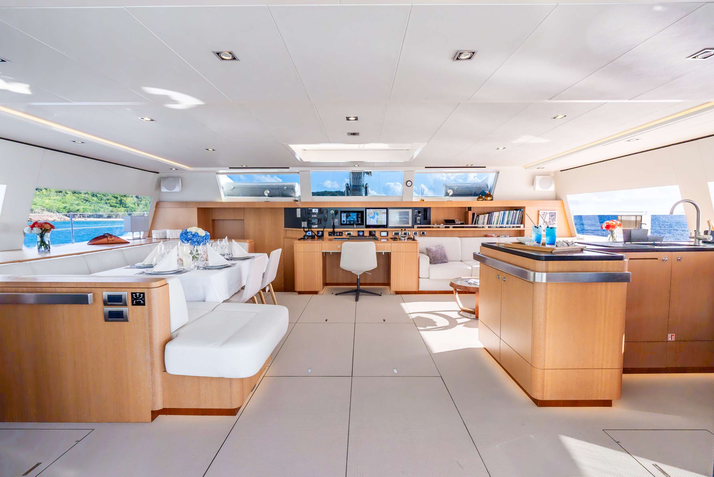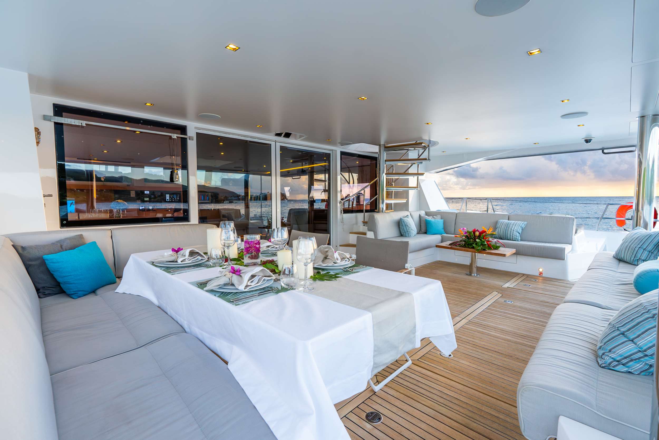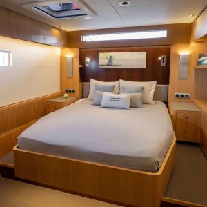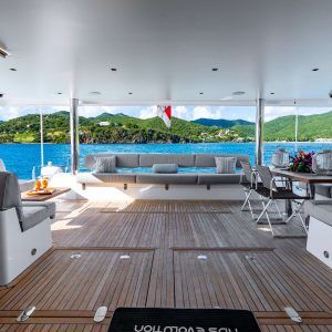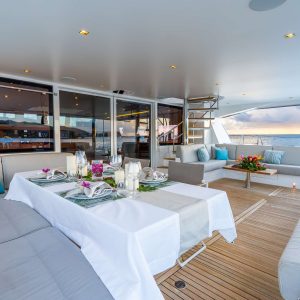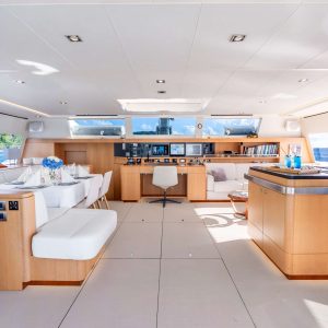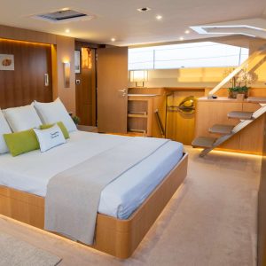 After a day on the water, guests can take advantage of the trampoline beds located on the bow, an ideal spot for soaking up the sun or enjoying a starlit evening. The spacious flybridge offers 360- degree view and is equipped with comfortable lounging, making it a perfect spot for cocktails and conversations.