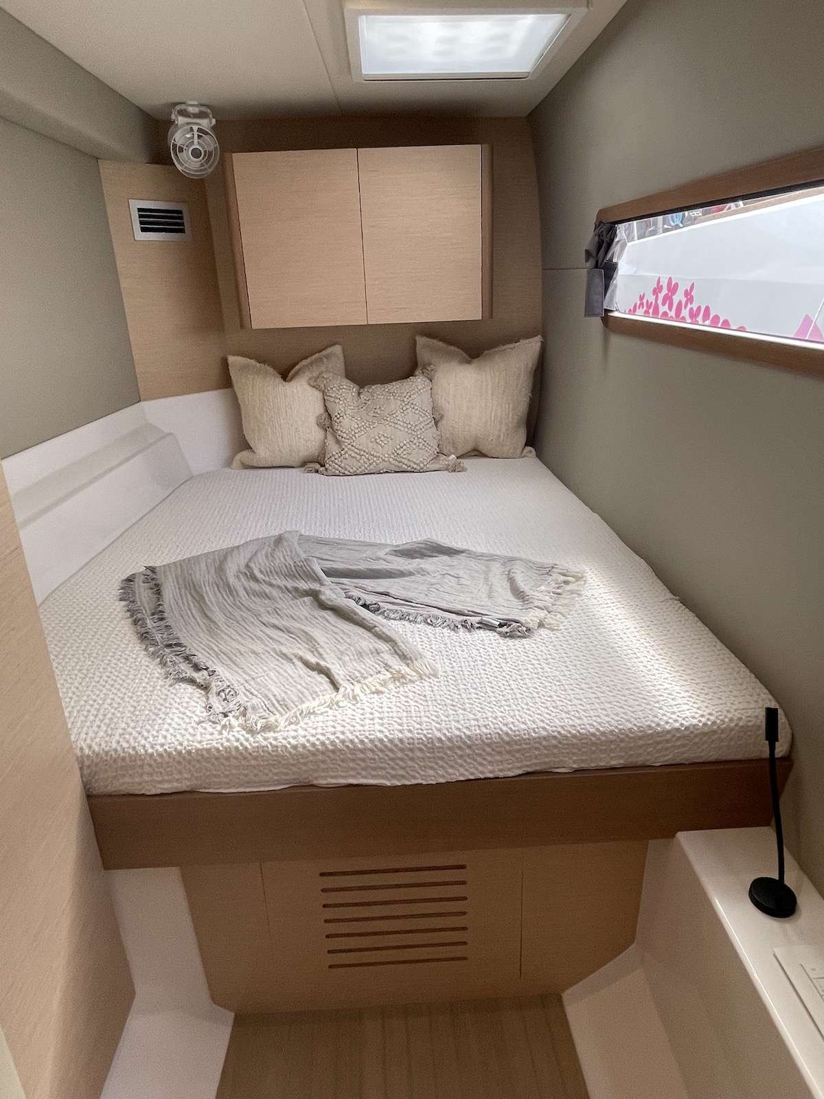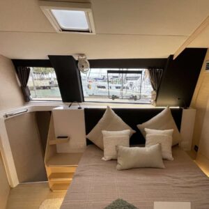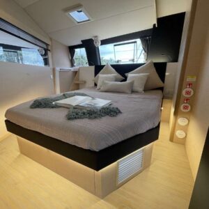 Neptune’s Escape hosts up to 8 guests in 4 queen-sized, air-conditioned cabins. Two of the cabins have their own, private ensuite bathrooms. The starboard master cabin is elegant, roomy and features a lavish multilevel design. The ensuite bathroom takes up almost the entire starboard hull featuring a full queen-sized cabin on the main level. The ensuite bathroom has a shower and separate vanity area below. The master suite also has direct private access to the main salon.