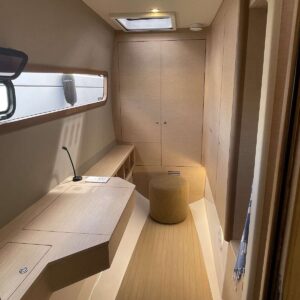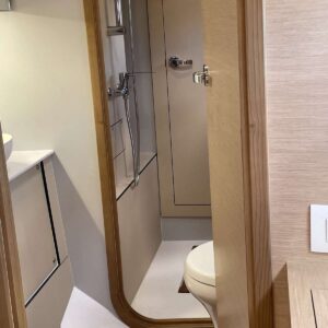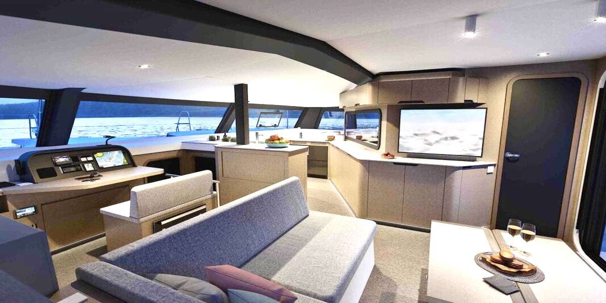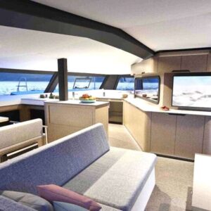 The large open concept salon living area seamlessly melds with the cockpit via a large sliding door system that provides wide panoramic views of the beautiful surroundings while reaffirming a highly functional freedom of movement throughout the yacht.