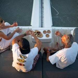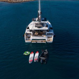 Additionally, a second cockpit on the foredeck offers dual functionality, serving as both seating and a deck chair area, seamlessly integrated with the forward trampoline.