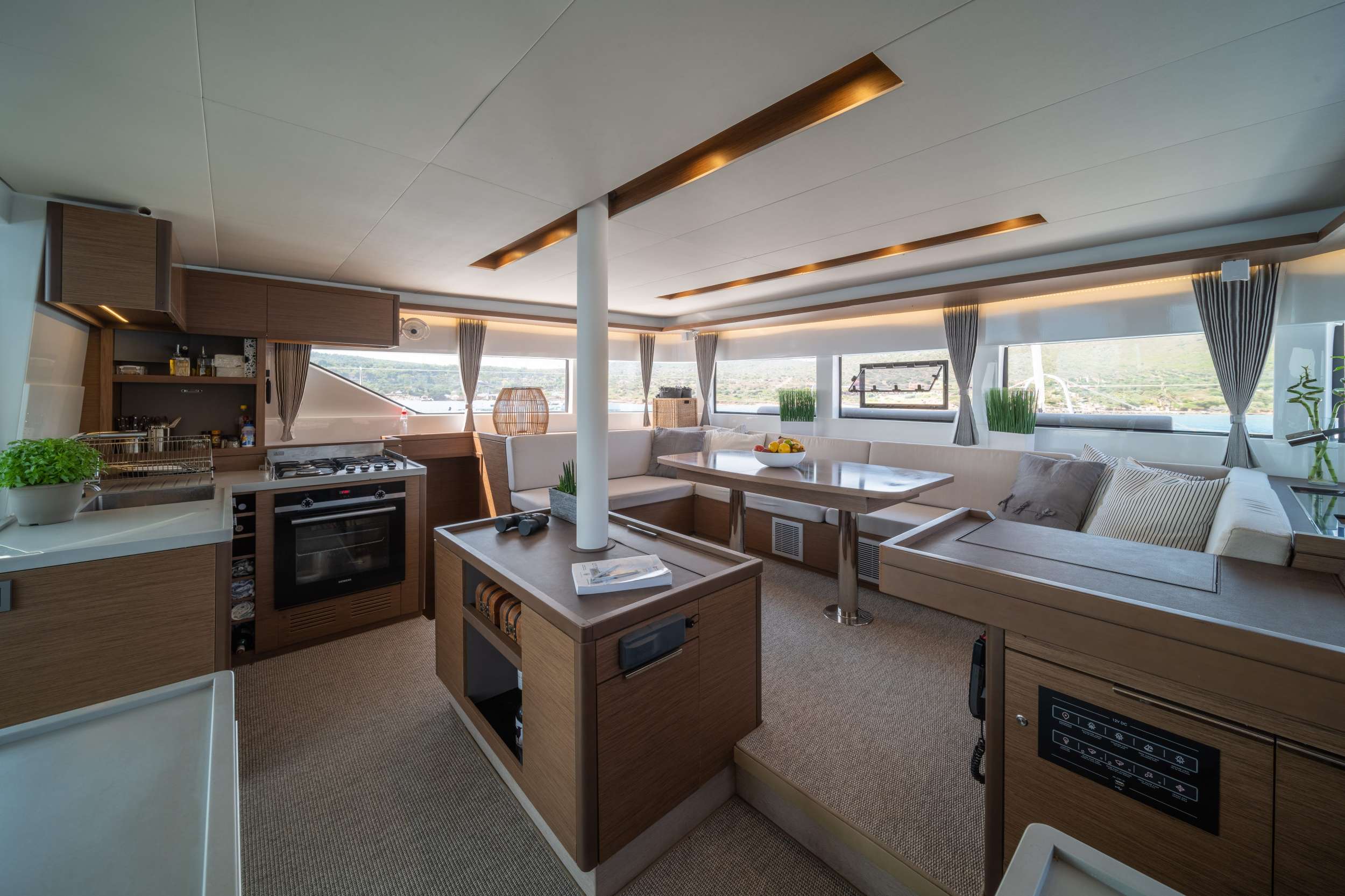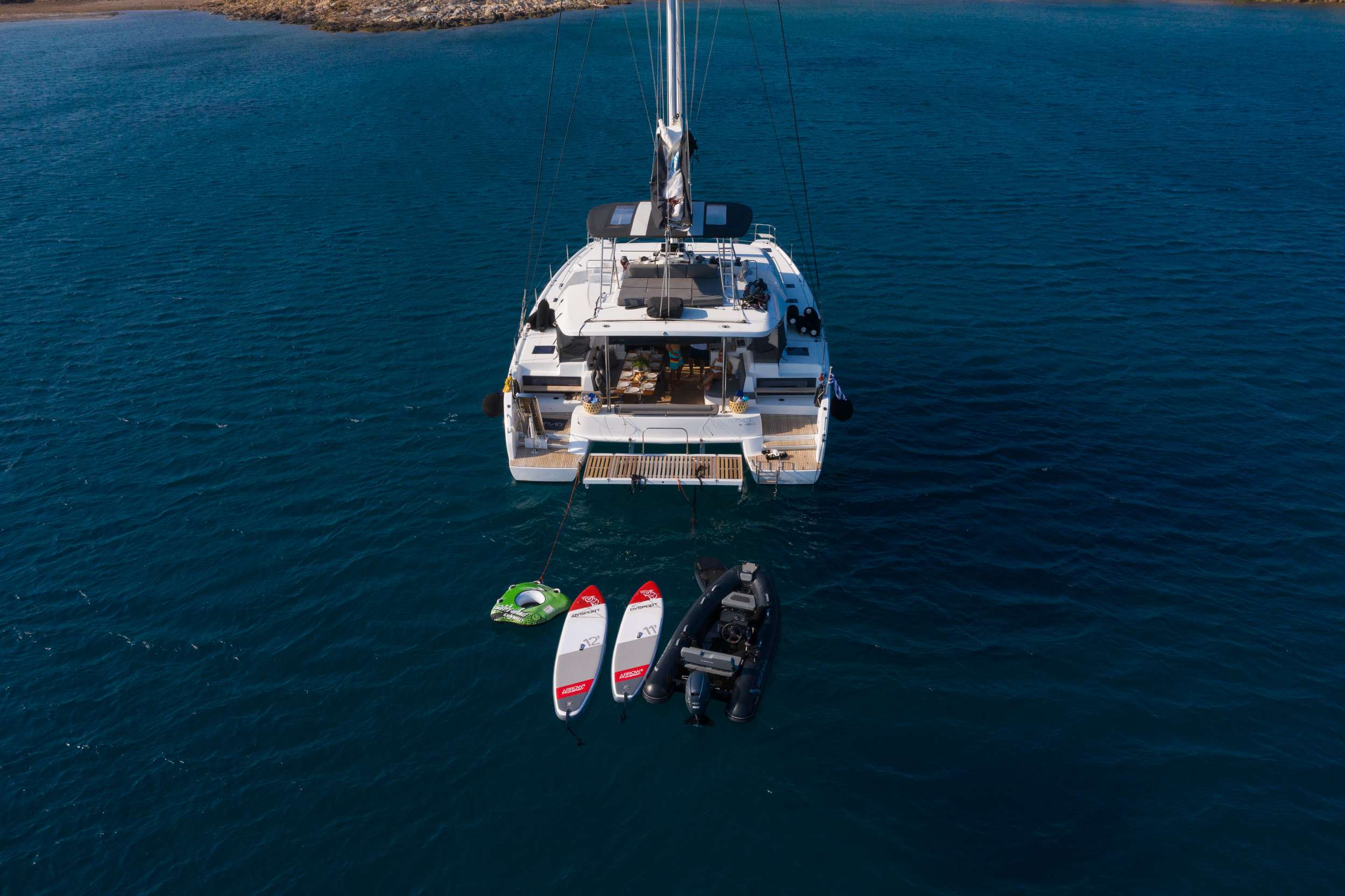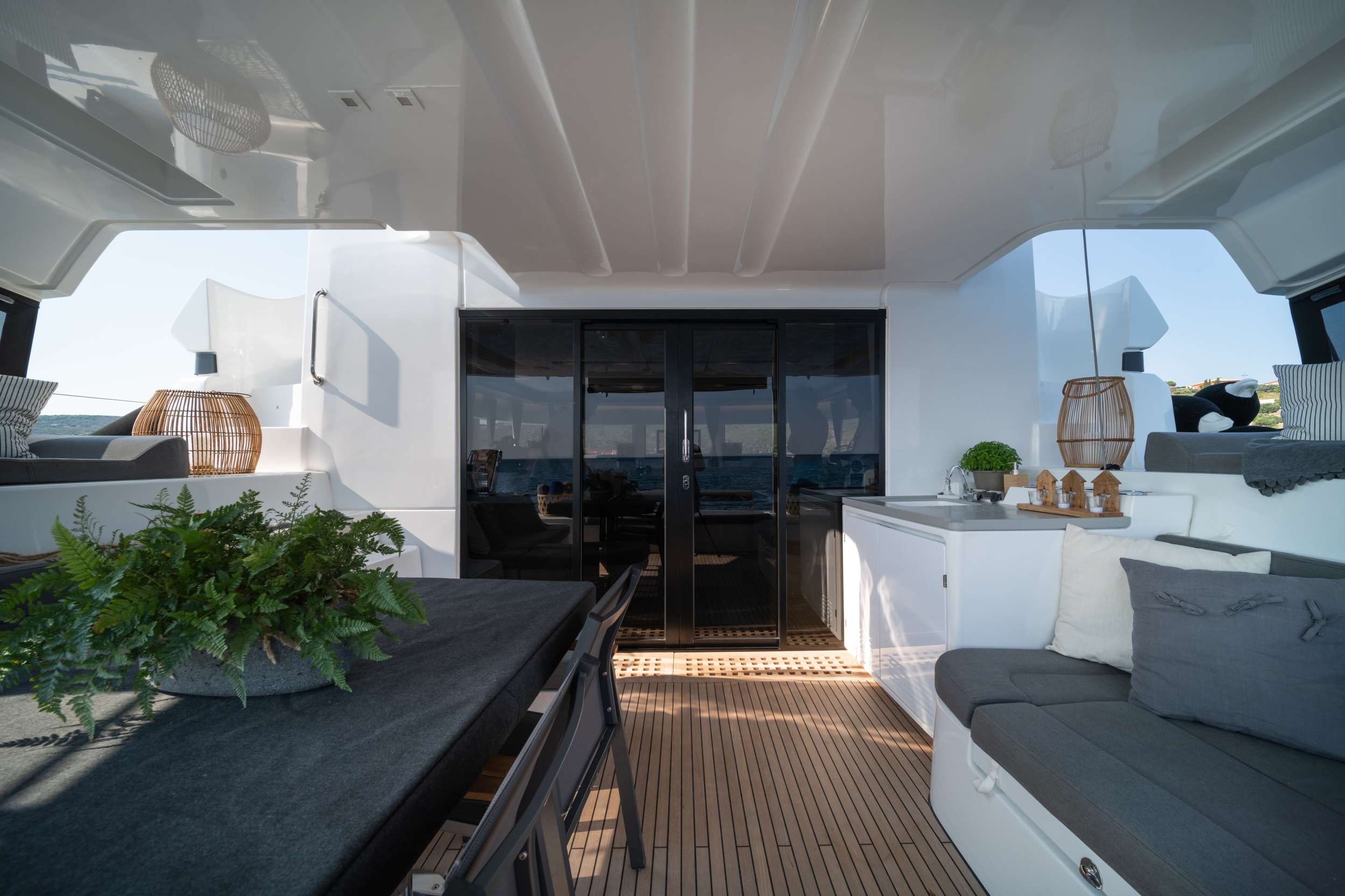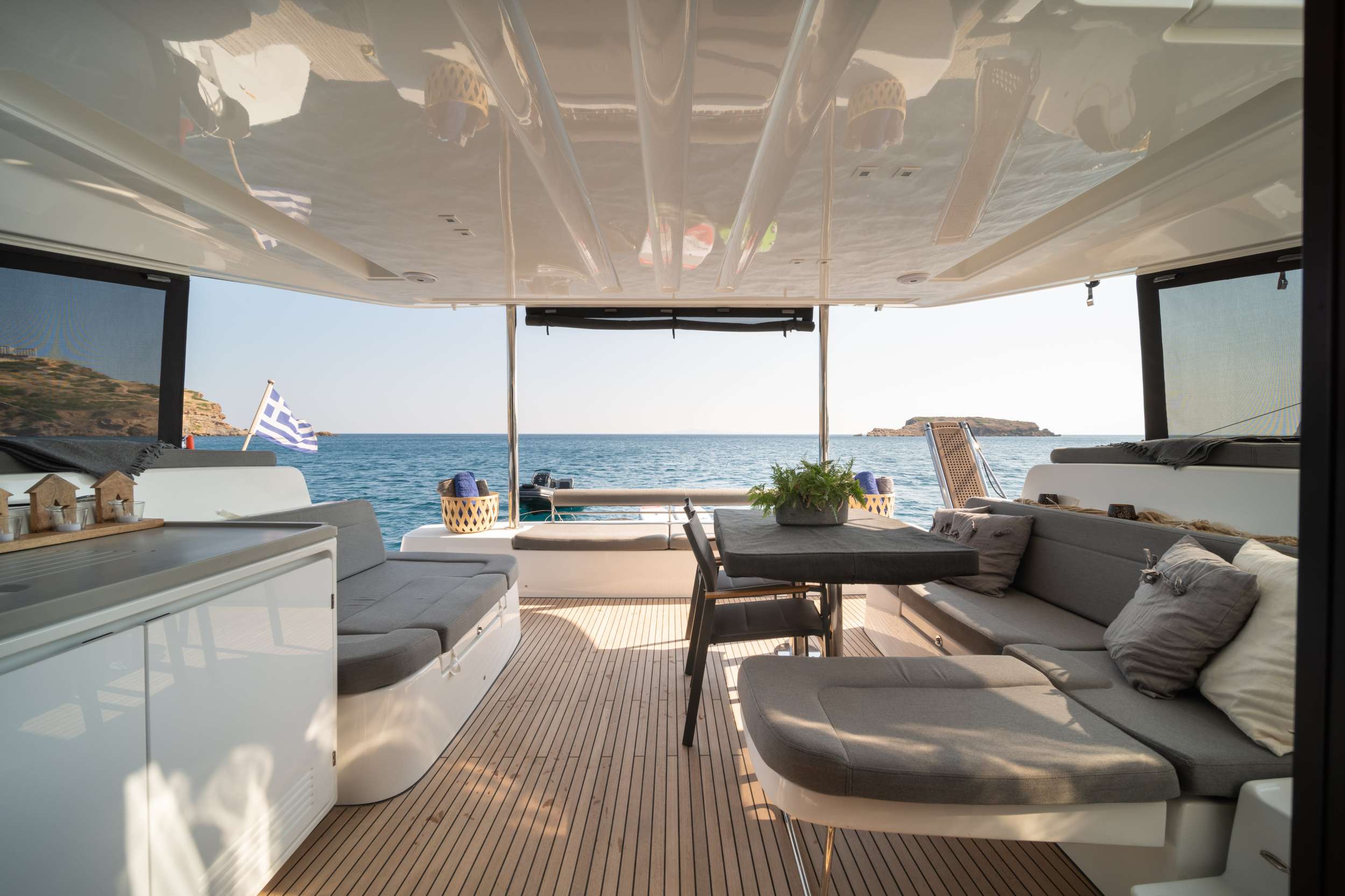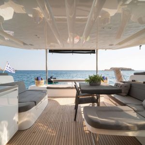 The expansive open cockpit faces the sea, with large stern skirts for easy access to the boat. The modular dining area, with removable bench seats, accommodates both children and adults comfortably.