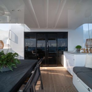 The flybridge, accessible via two secure entrances, includes a helm station with perfect visibility. Behind the helm, a large modular recreation area hides ample storage space for all the cushions.