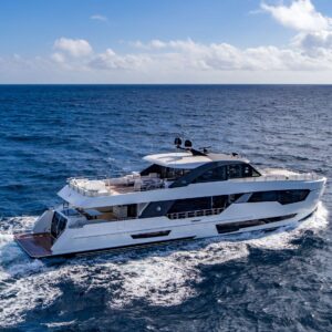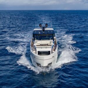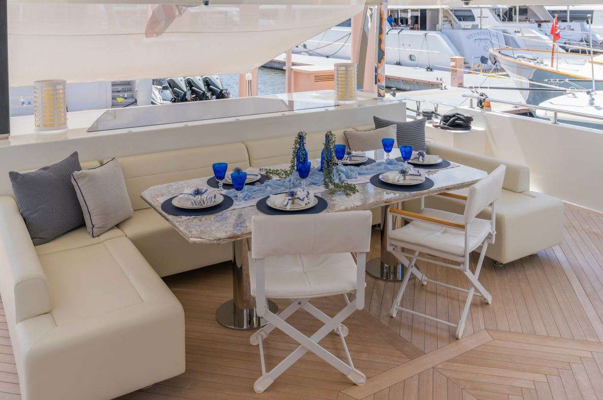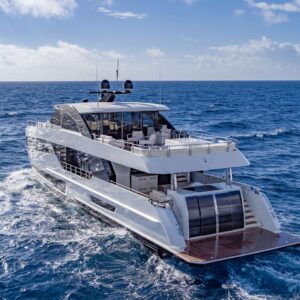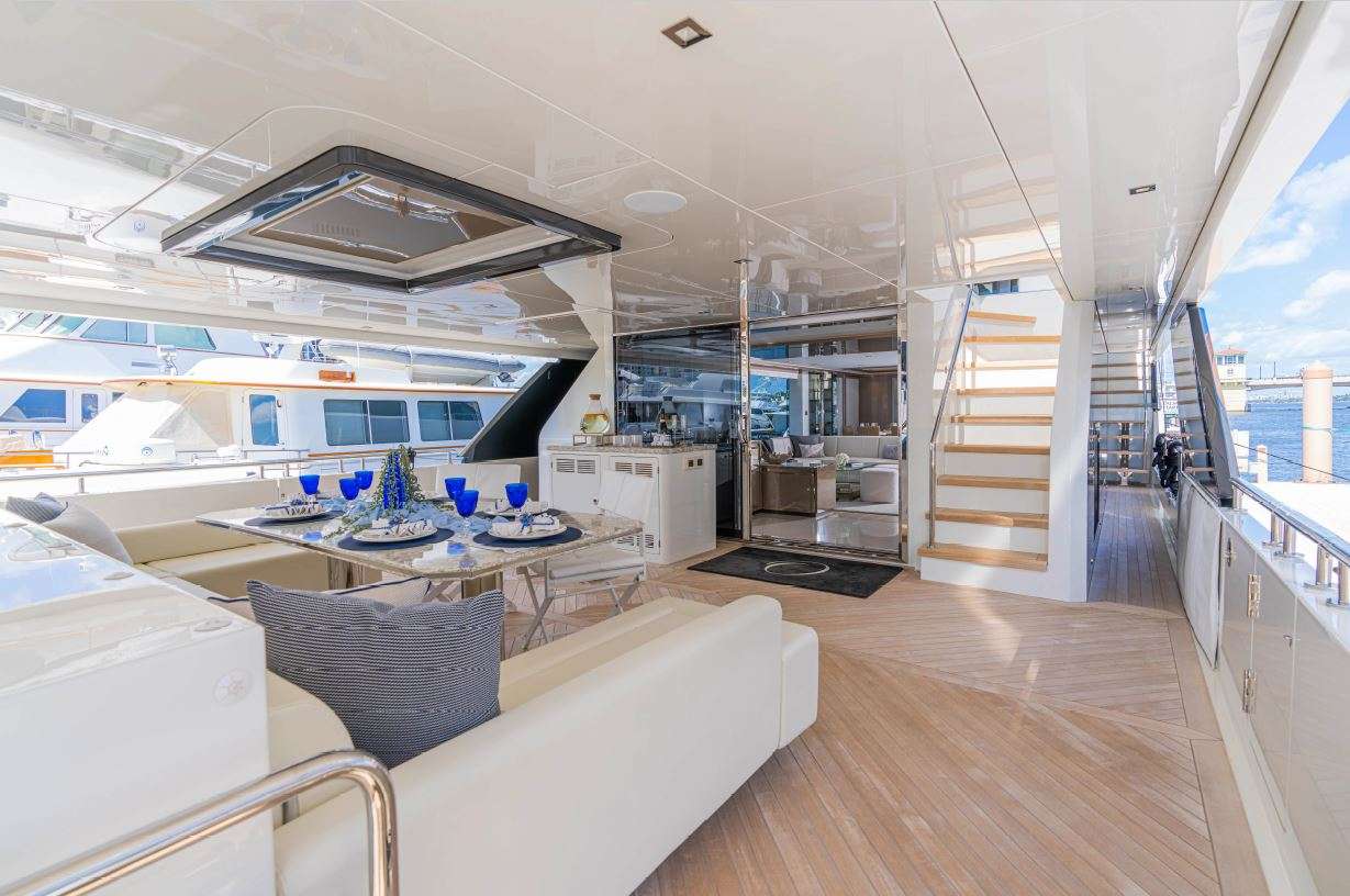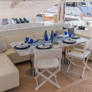 The outdoor spaces are equally impressive, with a large aft deck that is perfect for cocktails, meals, games, or lounging. The flybridge is a hub for alfresco entertainment and dining, complete with a jacuzzi and unobstructed views. The foredeck is spacious, with ample seating options and comfortable sun pads.