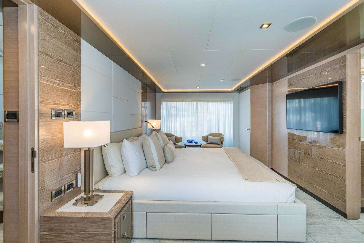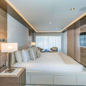 The master suite on the charter yacht O is a peaceful haven, featuring a king-size bed, a lounging area, and a vanity. The suite’s large windows allow natural light to flood the cozy interior, creating a serene atmosphere. The en-suite bathroom features his-and-hers sinks, a tub, and a shower.