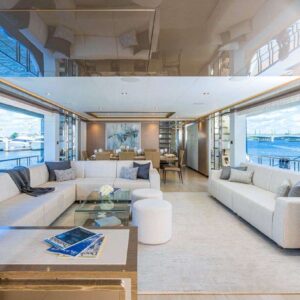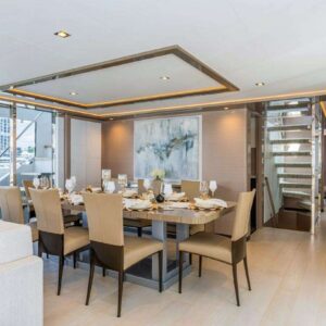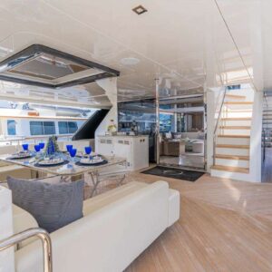In addition to the master suite, the yacht features a VIP stateroom with a queen-size bed, a guest stateroom with another queen-size bed, and two staterooms with convertible twin-size beds, perfect for families with children. The yacht’s modern interior styling and ambient lighting add a touch of elegance to each guest room.