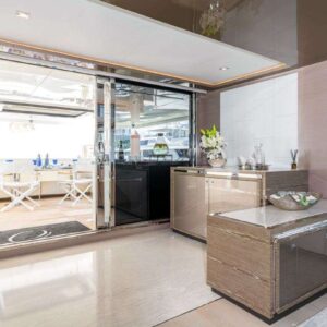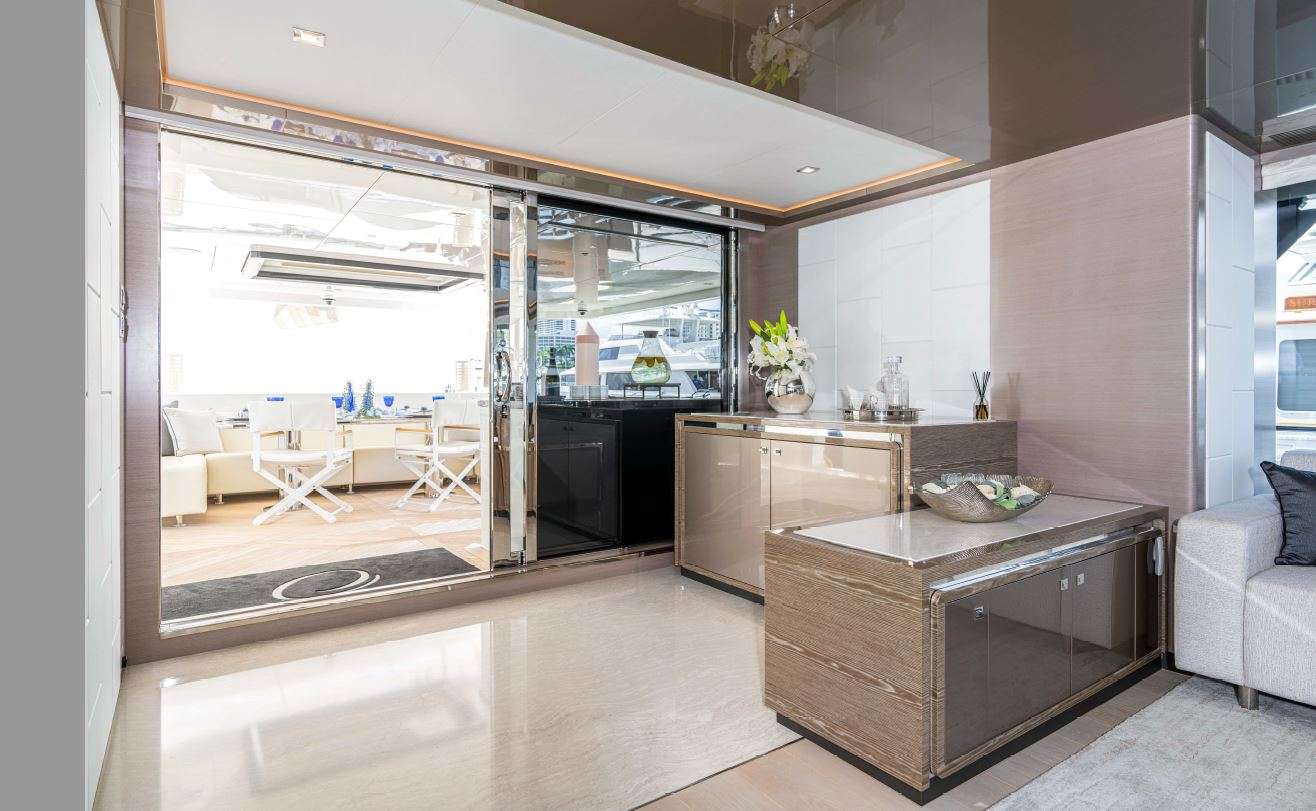 The main salon and formal dining area of O flow seamlessly from the aft deck, providing guests with stunning views and a luxurious ambiance. The yacht also features a sky salon, which is perfect for family movie nights or enjoying drinks at the wet bar.
