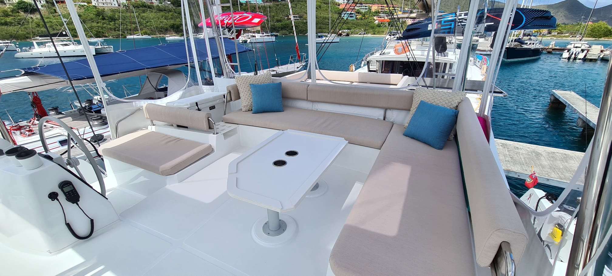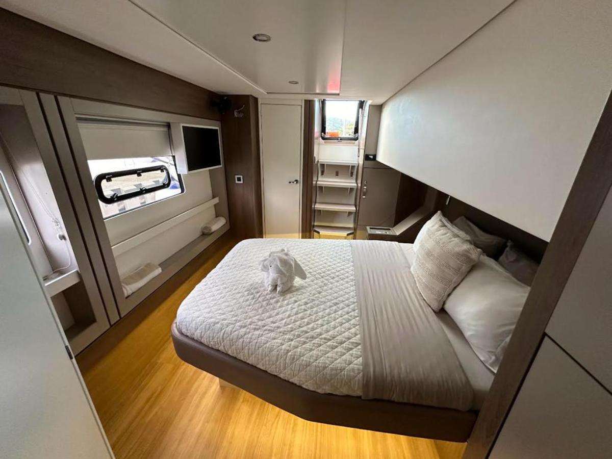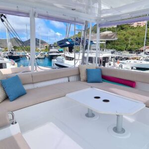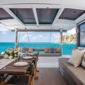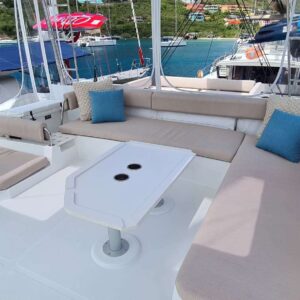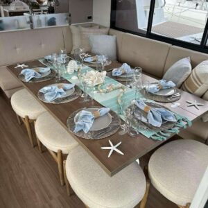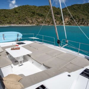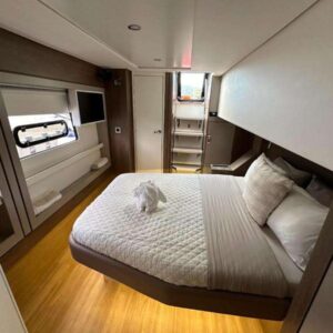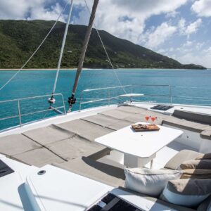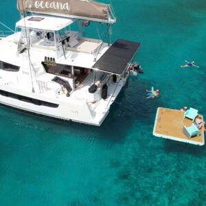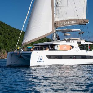 Oceana will accommodate 8 charter guests in 4 spacious queen cabins. She is a 2021 sailing catamaran offering soft foam decking that encompasses the entire deck and flybridge, lithium batteries and solar panels that allow the air conditioning to run without the generator, a water maker, ice maker, full sized refrigerator, a fully customizable menu, ecofriendly and reef safe toiletries, a bar stocked to guest preference, coffee/espresso machine, rendezvous scuba diving, snorkeling gear, underwater scooters, subwing, wakeboard, stand up paddle board, towable water tube, 10 ft. floating dock, pool noodles, fishing gear, board and card games, television in the salon, Fusion 3 Bluetooth enabled sound system and Oceana giveaways. Oceana is an award-winning yacht, having taken home the following awards: 2022 USVI Charter Yacht Show – Best Yacht Under 50 ft Runner Up; and 2023 USVI Charter Yacht Show – Best Yacht Under 50 ft Runner Up.