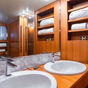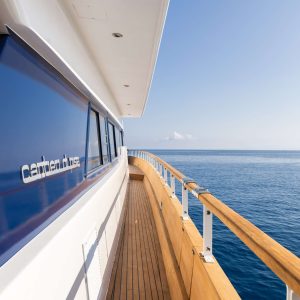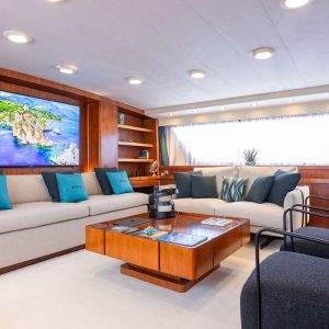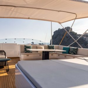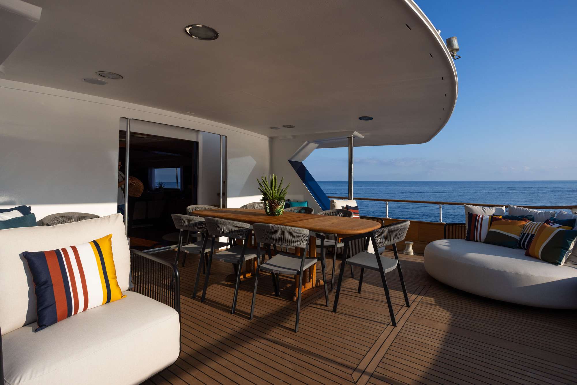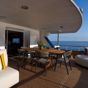 The aft deck offers a spacious dining table for up to 10 guests, while the foredeck is perfect for sunbathing. The sundeck includes an alfresco dining area and space for sunbathing.