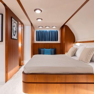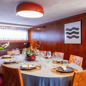 The interior spaces offer comfort and luxury, with a spacious living area, an indoor dining room, a fully equipped galley and well-appointed cabins.