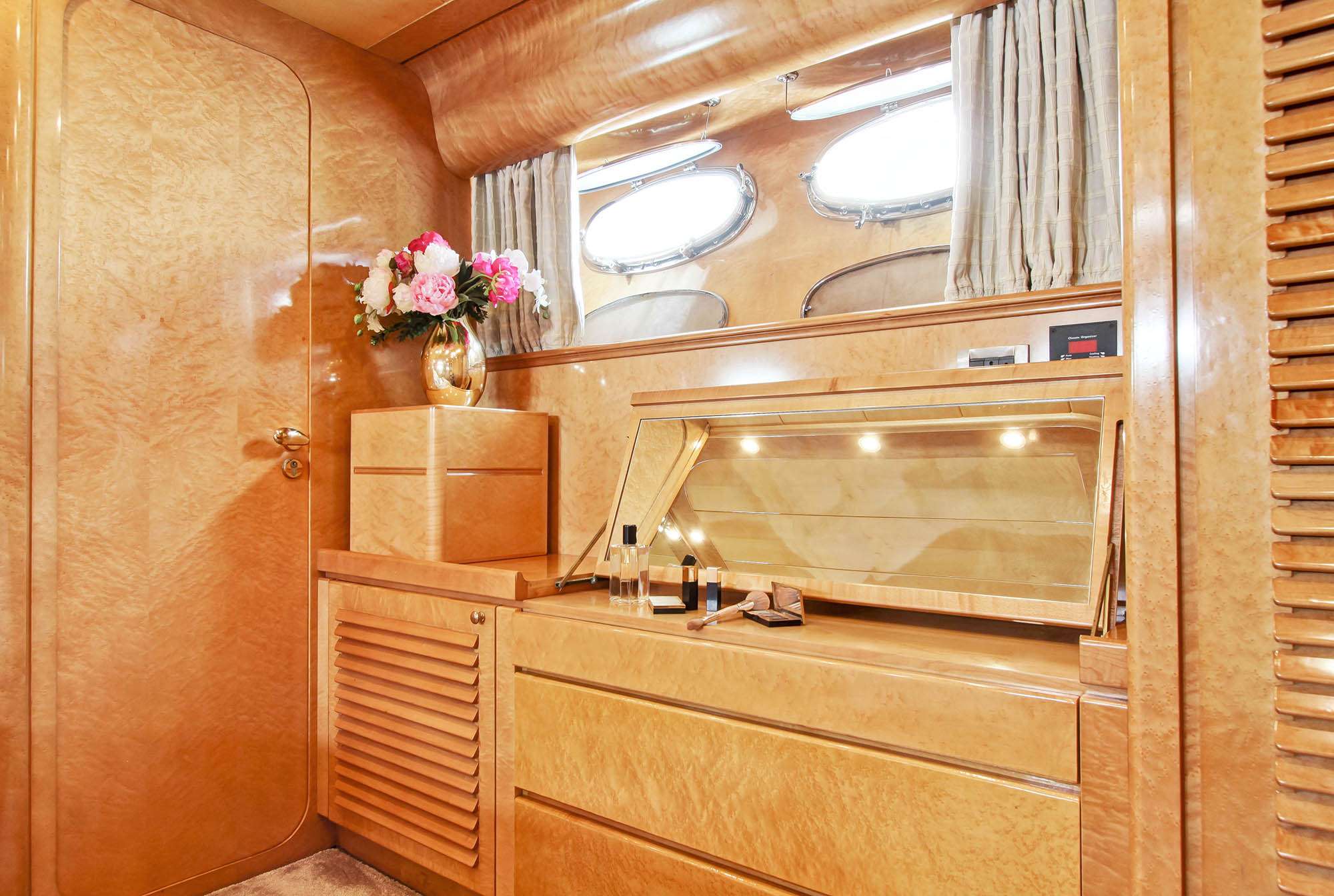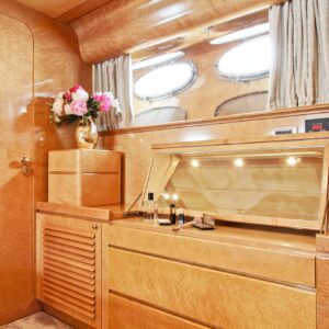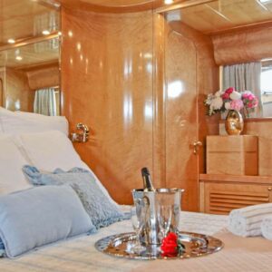 The lower deck is dedicated to night accommodation with 4 nice cabins for up to 10 guests: a master stateroom, a vip suite and two twins, both with additional pullman beds.