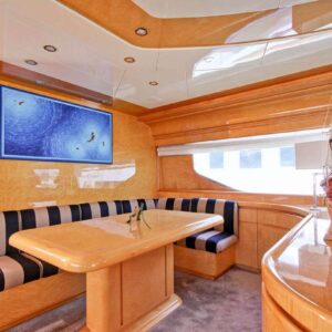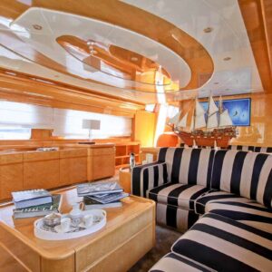 The wide salon, lined in fine wood and striped white/blue fabrics, holds a convertible sofa, a relaxing lounge area and a formal dining area.