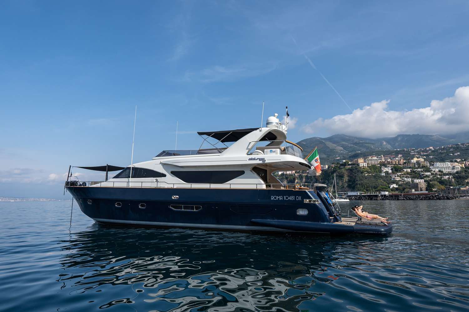 She features welcoming and refined interiors, finely appointed. The lower deck includes the night layout and offers accommodation for up to 10 guests in 4 luxurious staterooms: a full beam double bedded Master stateroom with walk-in closet, en-suite toilet and Tv Lcd-Dvd.