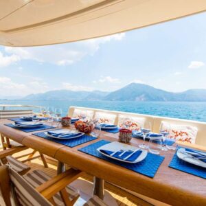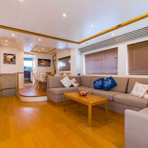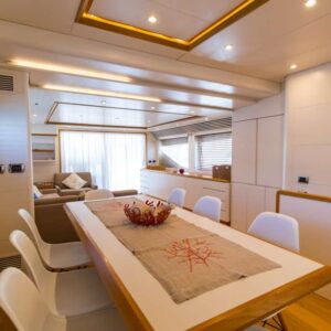 On the main deck, a beautiful salon offers ample space to relax on two sofas and a separate formal dining area. On the foredeck a spacious and perfectly equipped galley allows our chef on board to cook delicious meals and the bridge deck also include a sofa with a coffee table to enjoy the navigation.