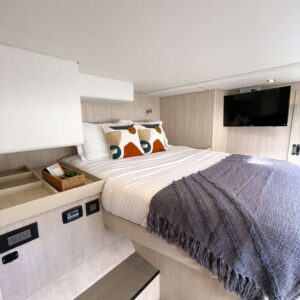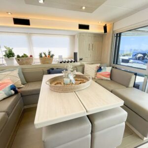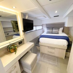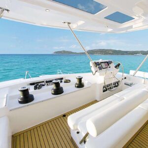 Ruby One features three queen-berth guest suites for discerning guests, and a bespoke extra-large main deck saloon. The saloon is fronted by a private forward lounging cockpit.