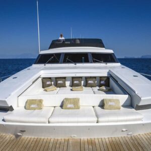 The main deck aft comes furnished with a welcoming table for 8 to enjoy elegant alfresco dining and a beach platform for an easy access to the sea.